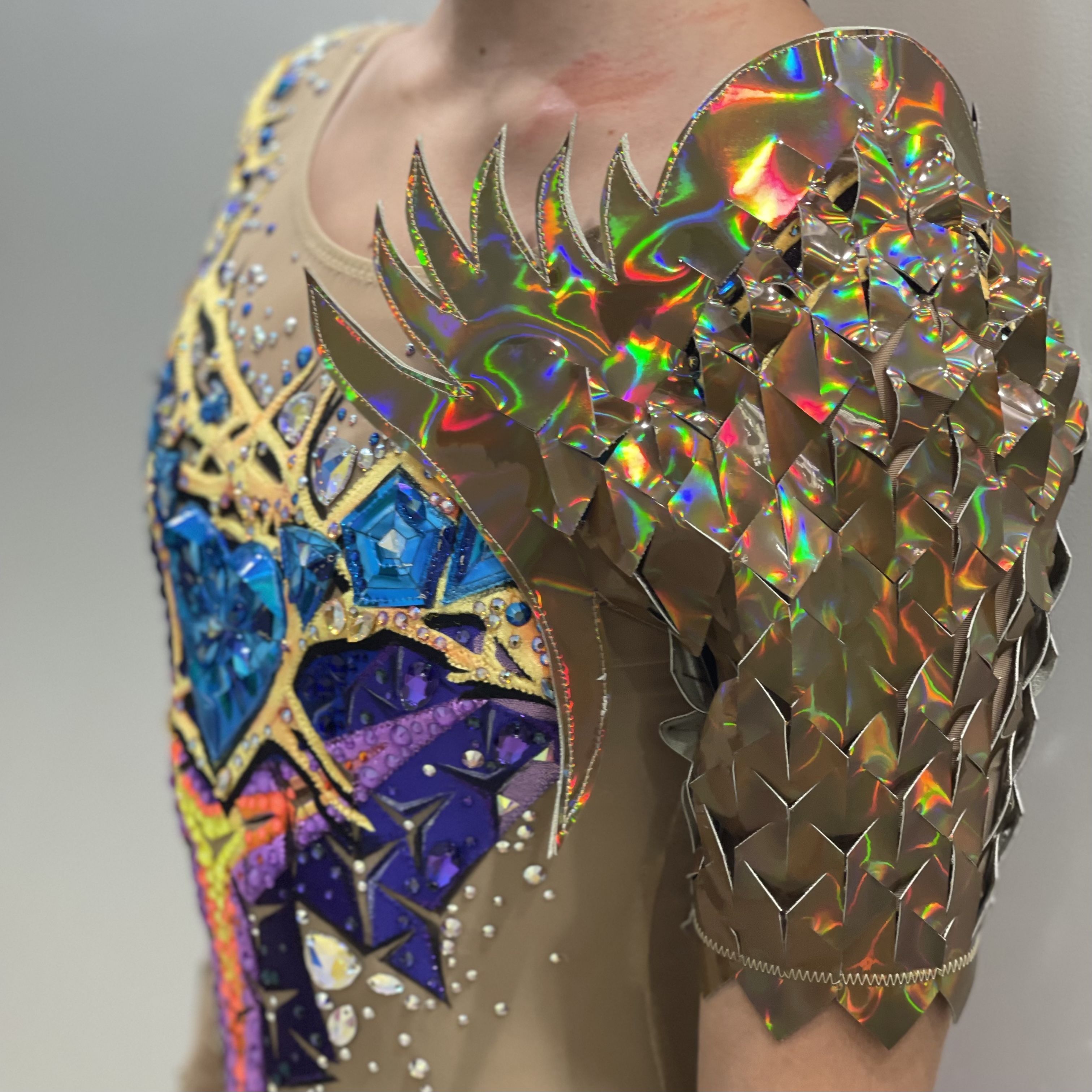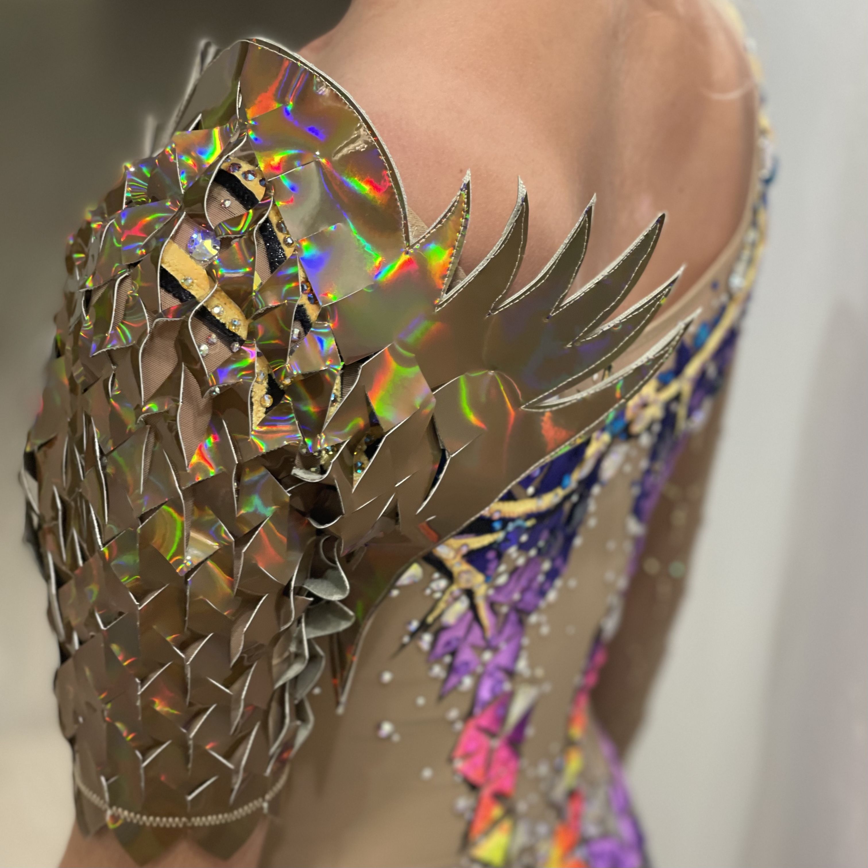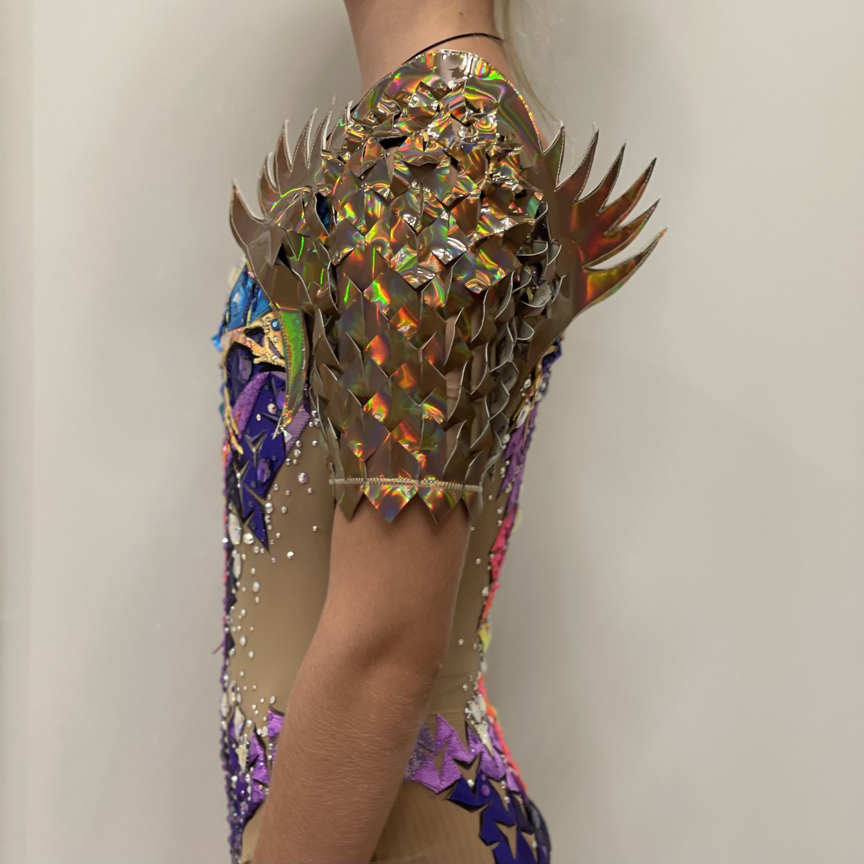 В своей работе я использовала винил взглянув на него с другого  ракурса, как на отдельный элемент, придав ему способность растягиваться, повторяя форму тела, создав оригинальную текстуру поверхности. Рукав из винила подчёркивает образ своей остротой и колкостью формы, но он также как и кристаллы переливается и привлекает взгляд.