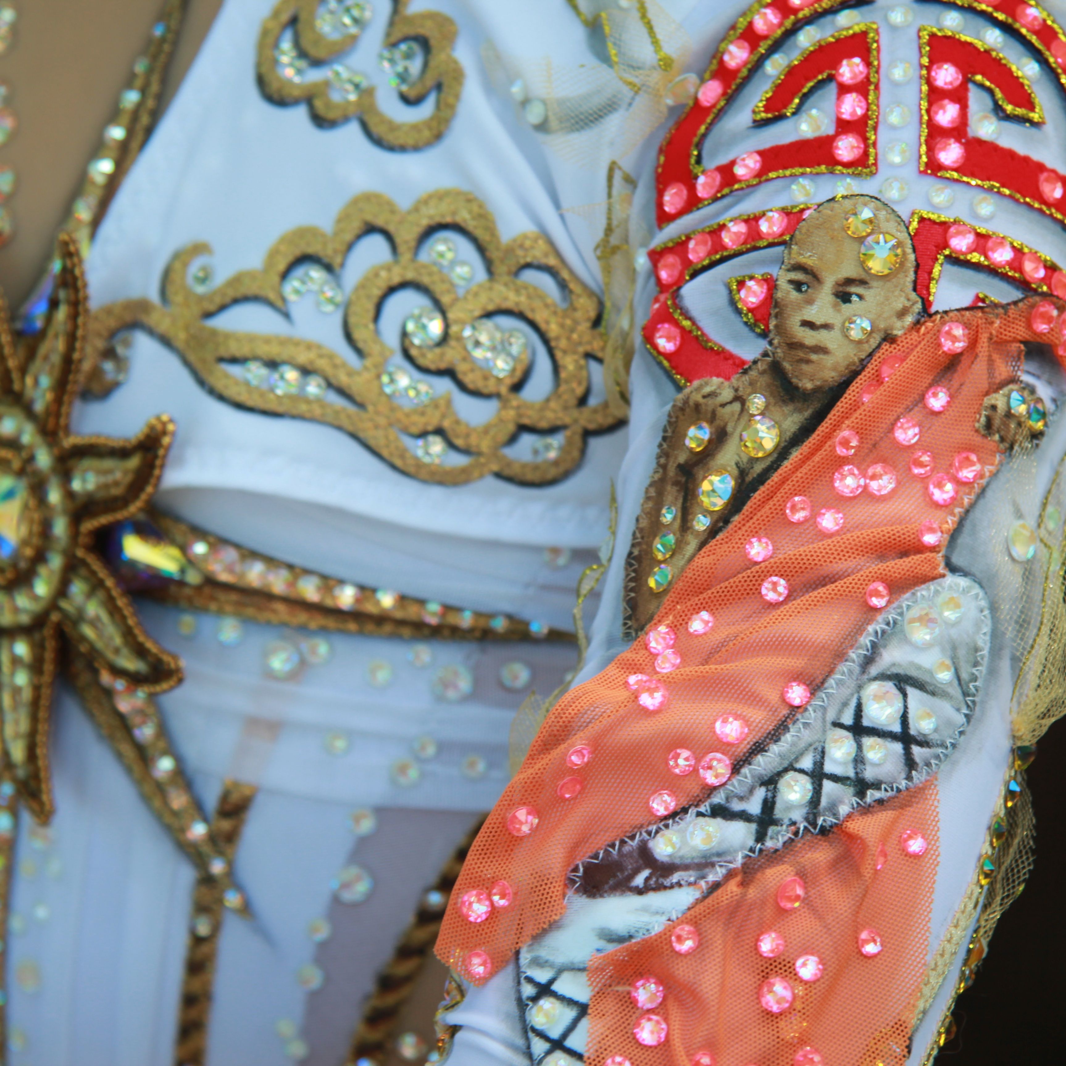 В основе композиции конкурсной работы лежит символ Розы ветров, указывающей на стороны света: Запад и Восток; красочную Бразилию и мистический Китай; зажигательную красавицу-участницу Карнавала в Рио-де-Жанейро и бесстрашного несгибаемого монаха Шаолинь. На юбке располагается люневильская вышивка, повторяющая очертания Африканского и Азиатского континентов.
