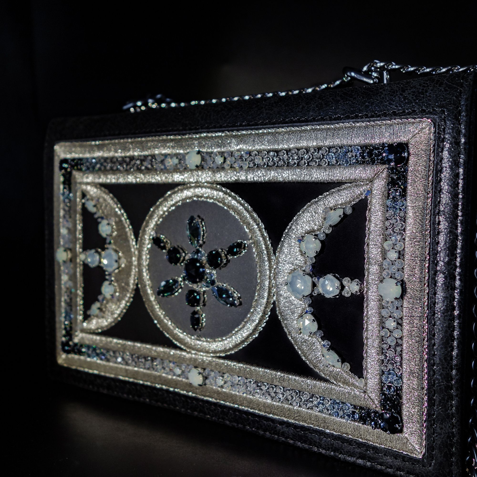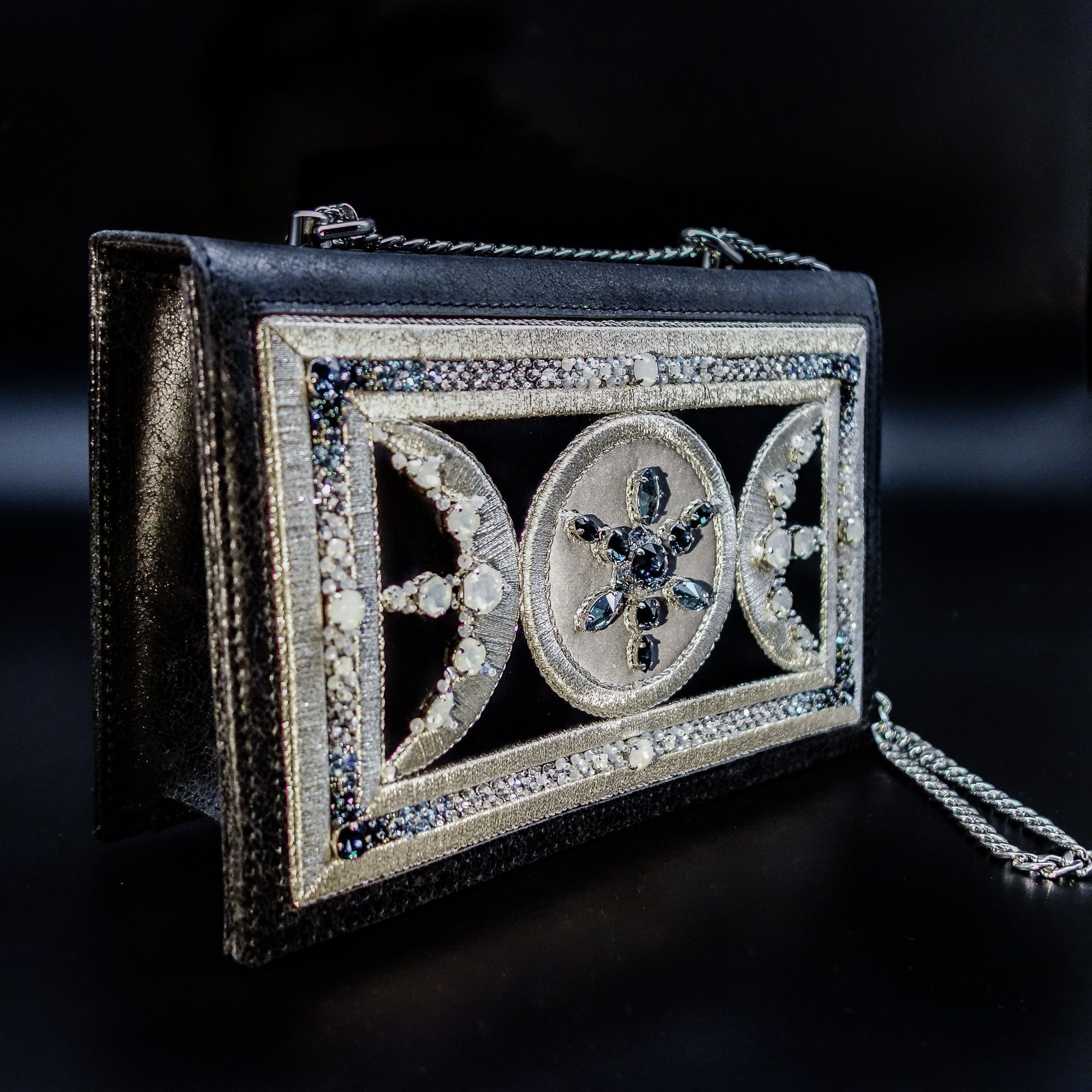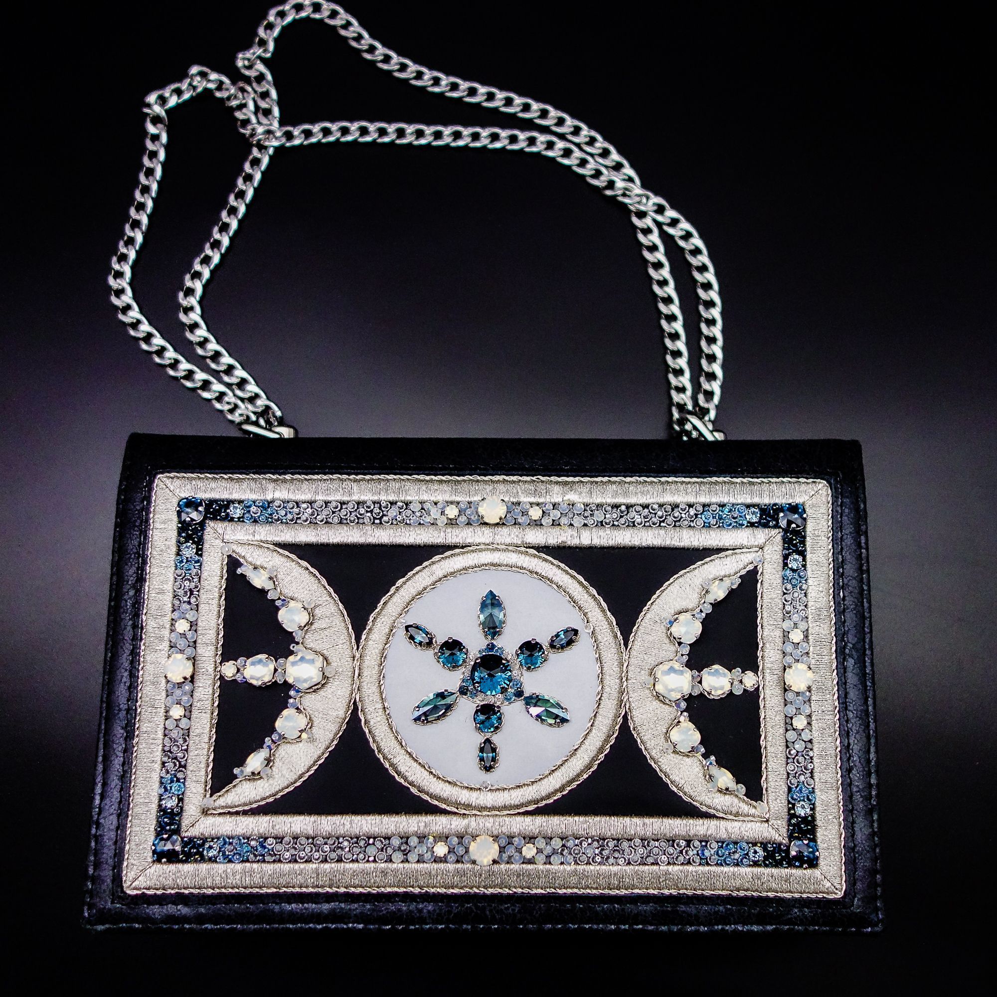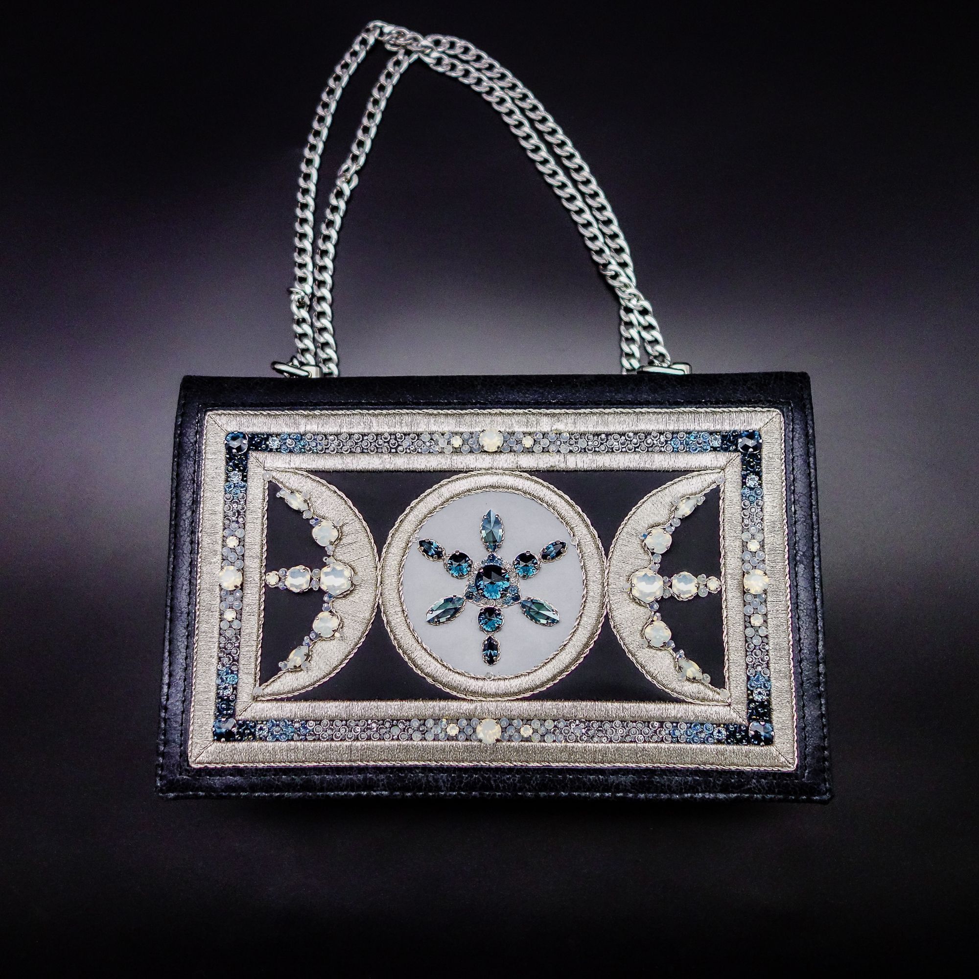 И, конечно же,  материал и форма самой сумки подбирался в соответствии с общим концептом: сине-черная фактурная кожа с легким блеском, чтобы подчеркнуть цвета, строгая геометрия формы повторяющая форму вышивки, переплетение звеньев цепи, так свойственное кельтским орнаментам.