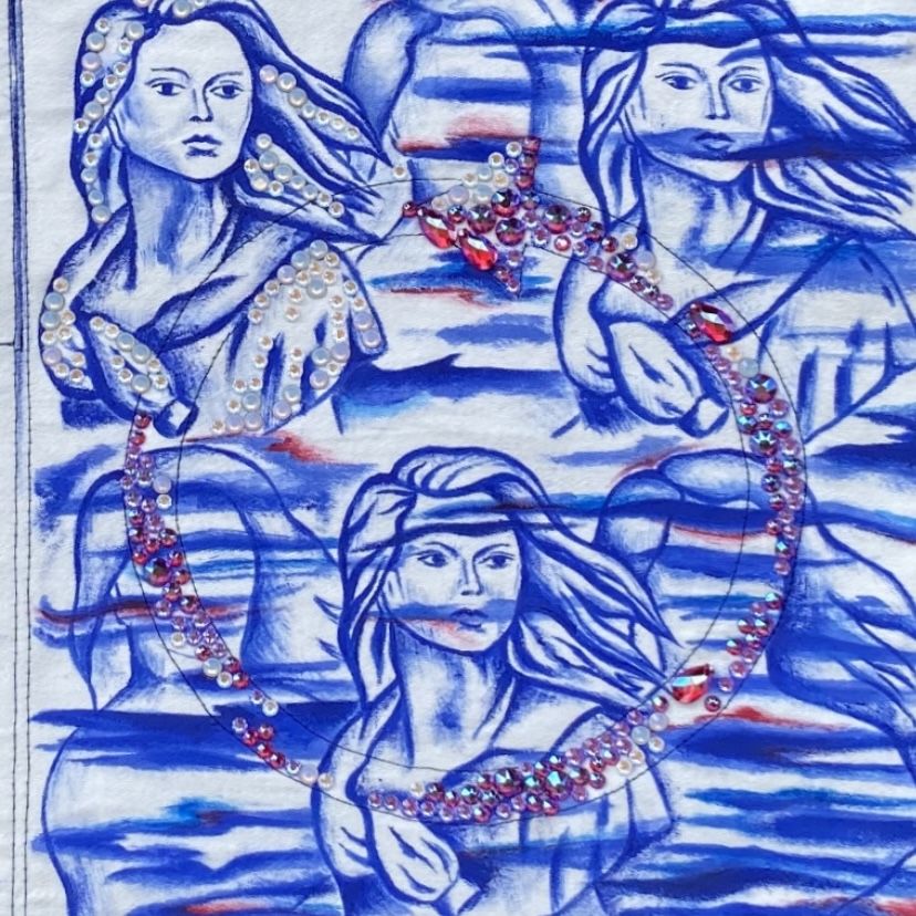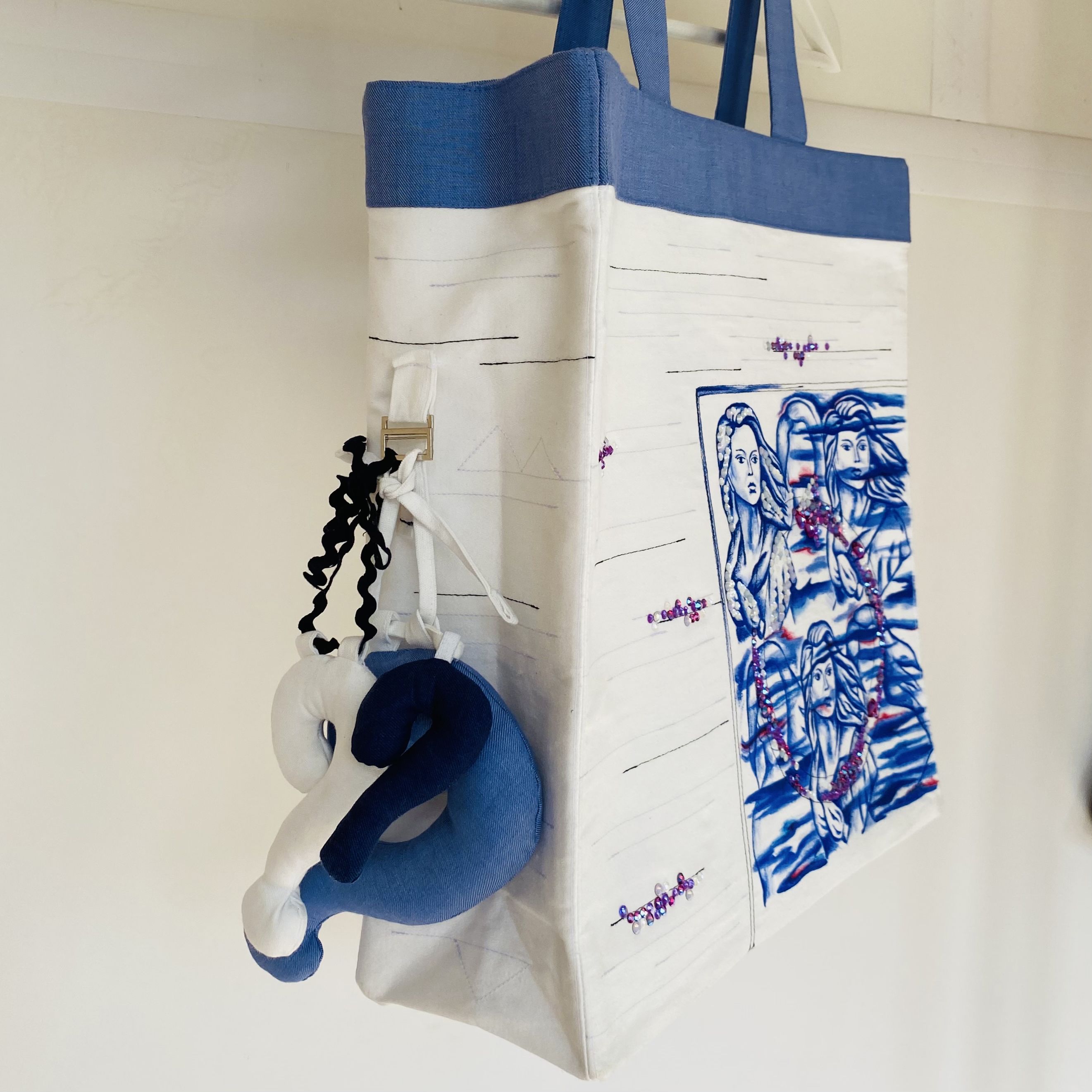 Женские, скульптурные образы, олицетворяющие массу-толпу, застыли в ожидании. Они статичны, они ждут - что будет? Смазанные черты лиц, говорят о невозможности их действий,о затворе в паузе времени быть свободной в своем выборе. Синий,ультрамариновый цвет на мой взгляд  перекликается  и отсылает к волнению на море, к началу шторма. Главной идеей является желание повернуть ситуацию во времени вспять ,где был полный штиль. Отстрочки на сумке, это летающие мысли в обществе -они разные. С торца мякиши-вопросы-будет штиль? Сегодня тема не актуальна, я успокоилась и пусть не штиль, но не шторм в душе.