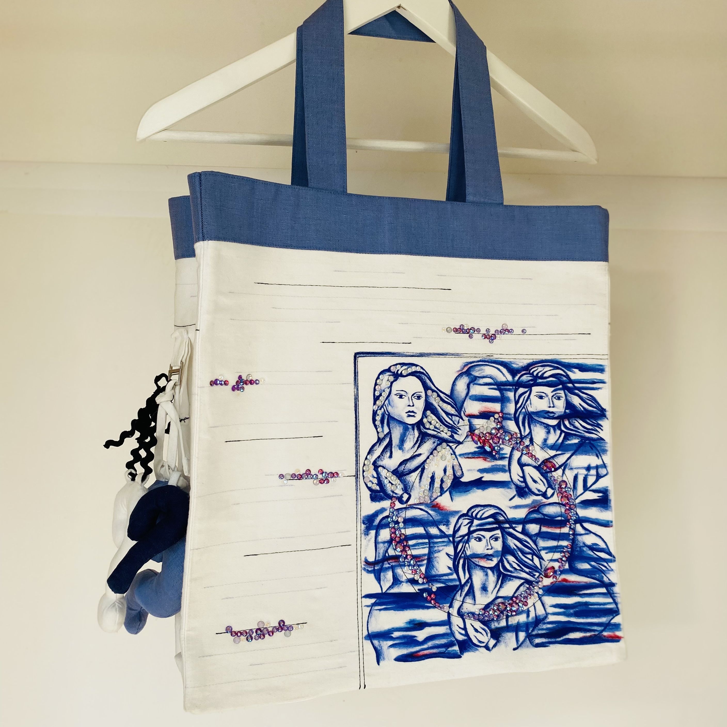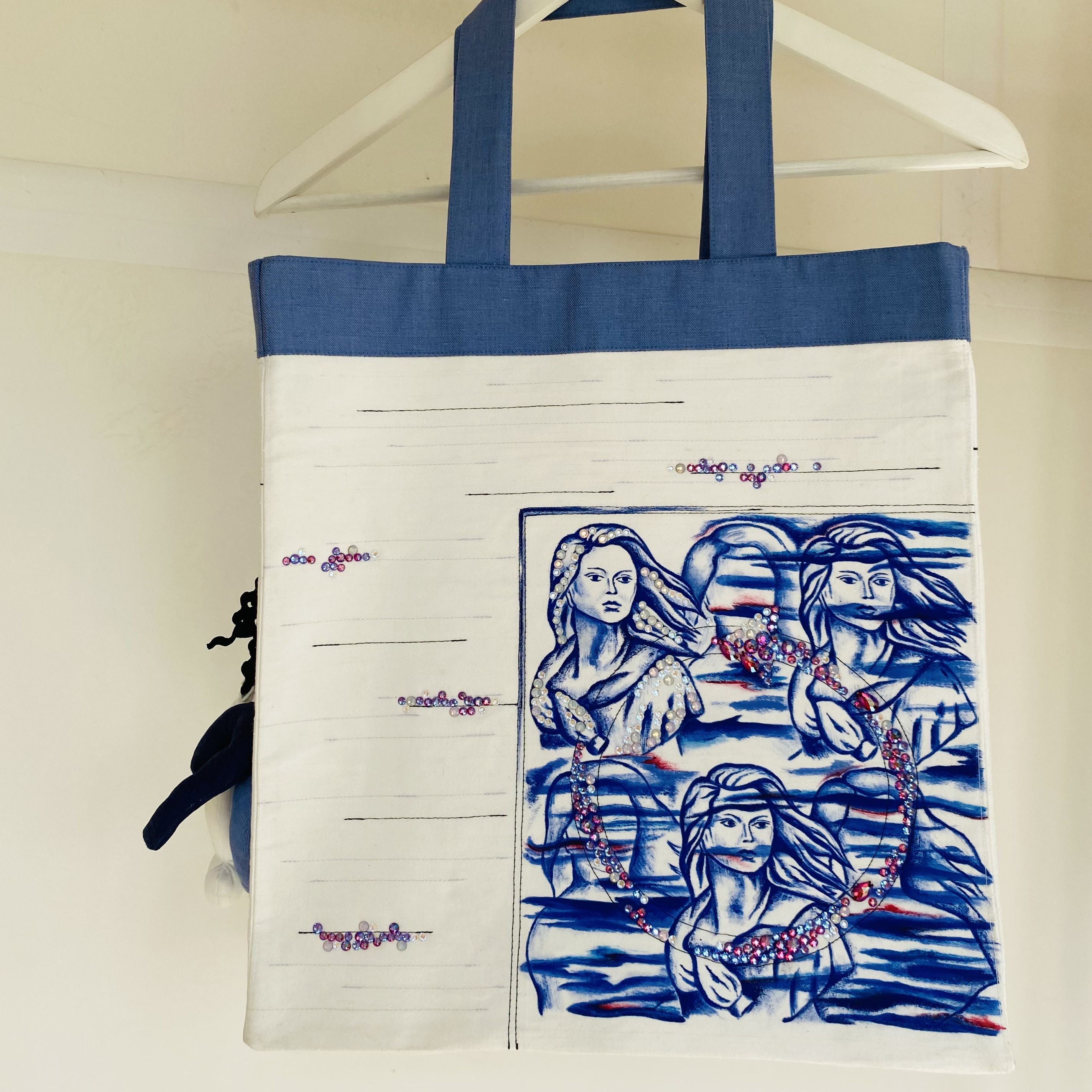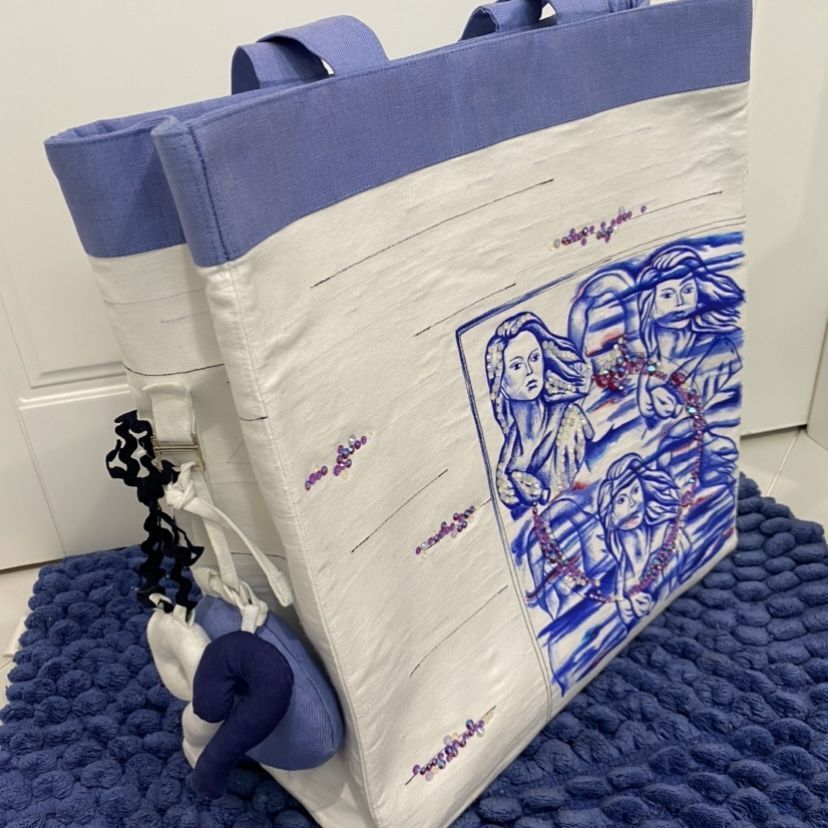 У меня современная сумка-шоппер, большая, вместительная и повседневная. Когда я искала тему для эскиза, было объявлено об обязательной вакцинации. Совершенно не планировала брать уже уставшую тему коронавируса, но мои чувства не переключались на что-то другое. И эта моя работа, мое послание чувств и эмоций в то время.