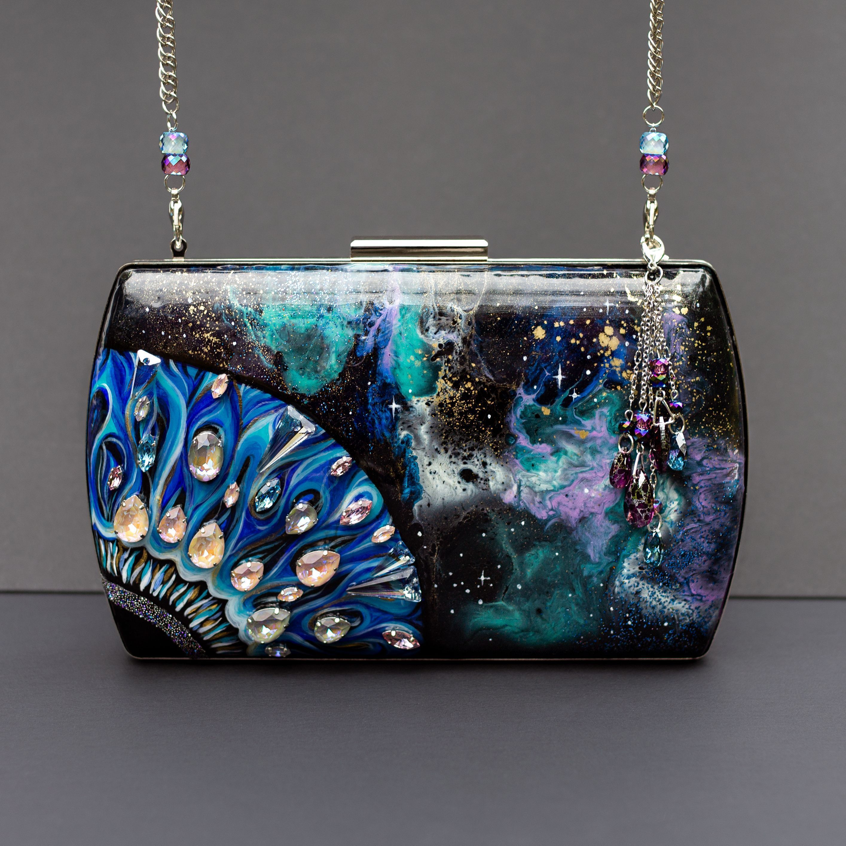 Последняя коллекция Swarovski 2022 "в поисках нового" меня натолкнула на использование новых технологий в декоре сумочки. Здесь сочетаются художественная роспись акриловыми красками и резин-арт (эпоксидная смола), абстракция и конкретика, глянцевые поверхности с блеском страз и кристальной ткани.