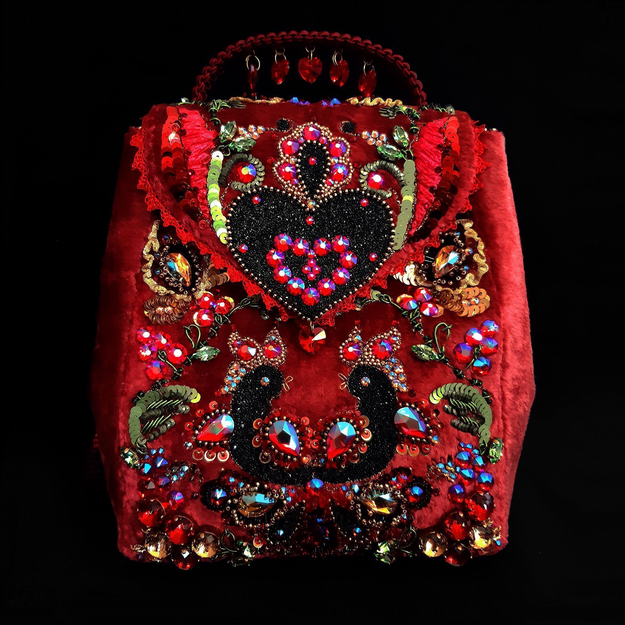 Материалом основы послужил советский плюш (нестандартный материал для изготовления сумок). Я решила его использовать, чтобы показать уют и мягкость рюкзака, как плюшевая игрушка. А в сочетании с четкими гранями кристаллов он приобрел изысканный вид.