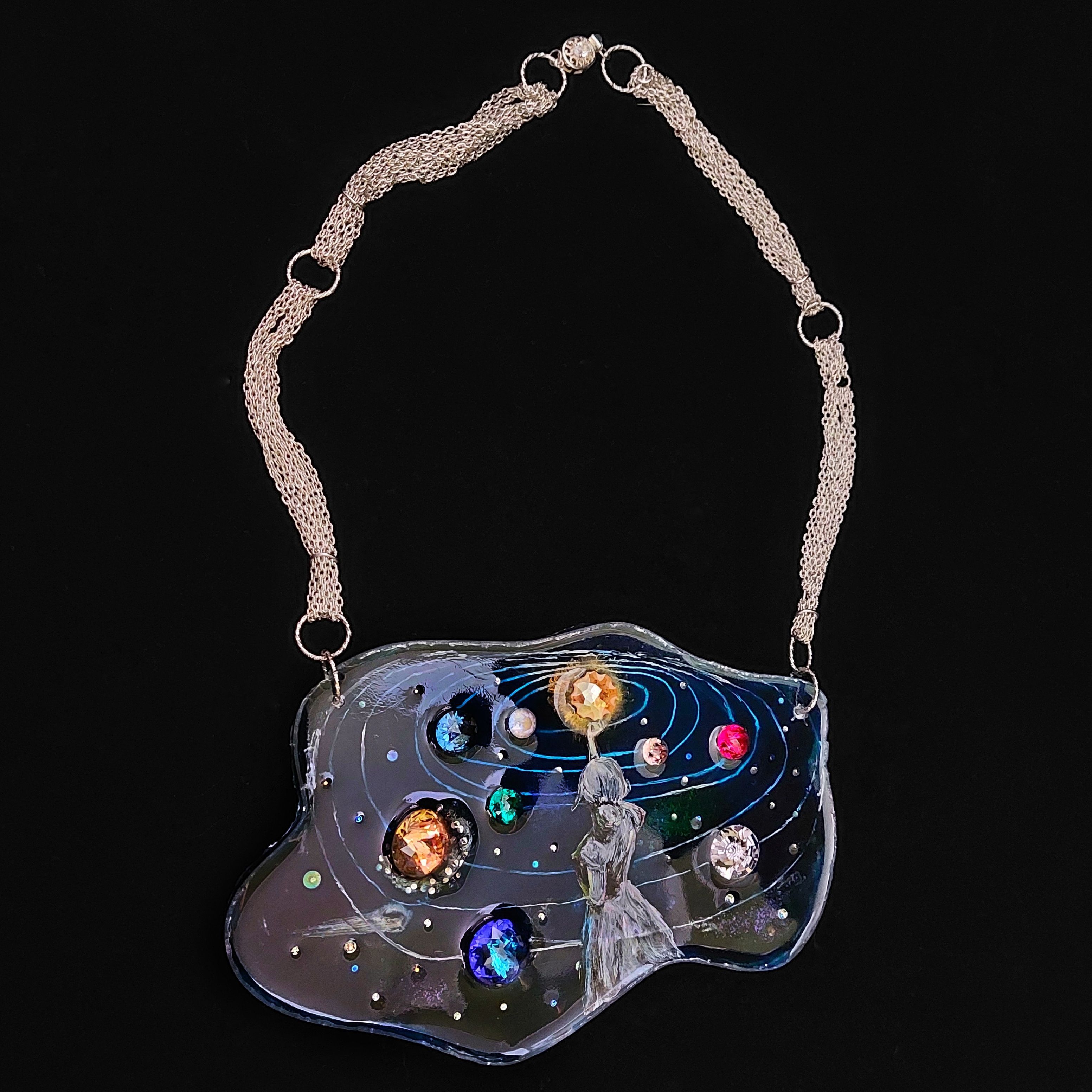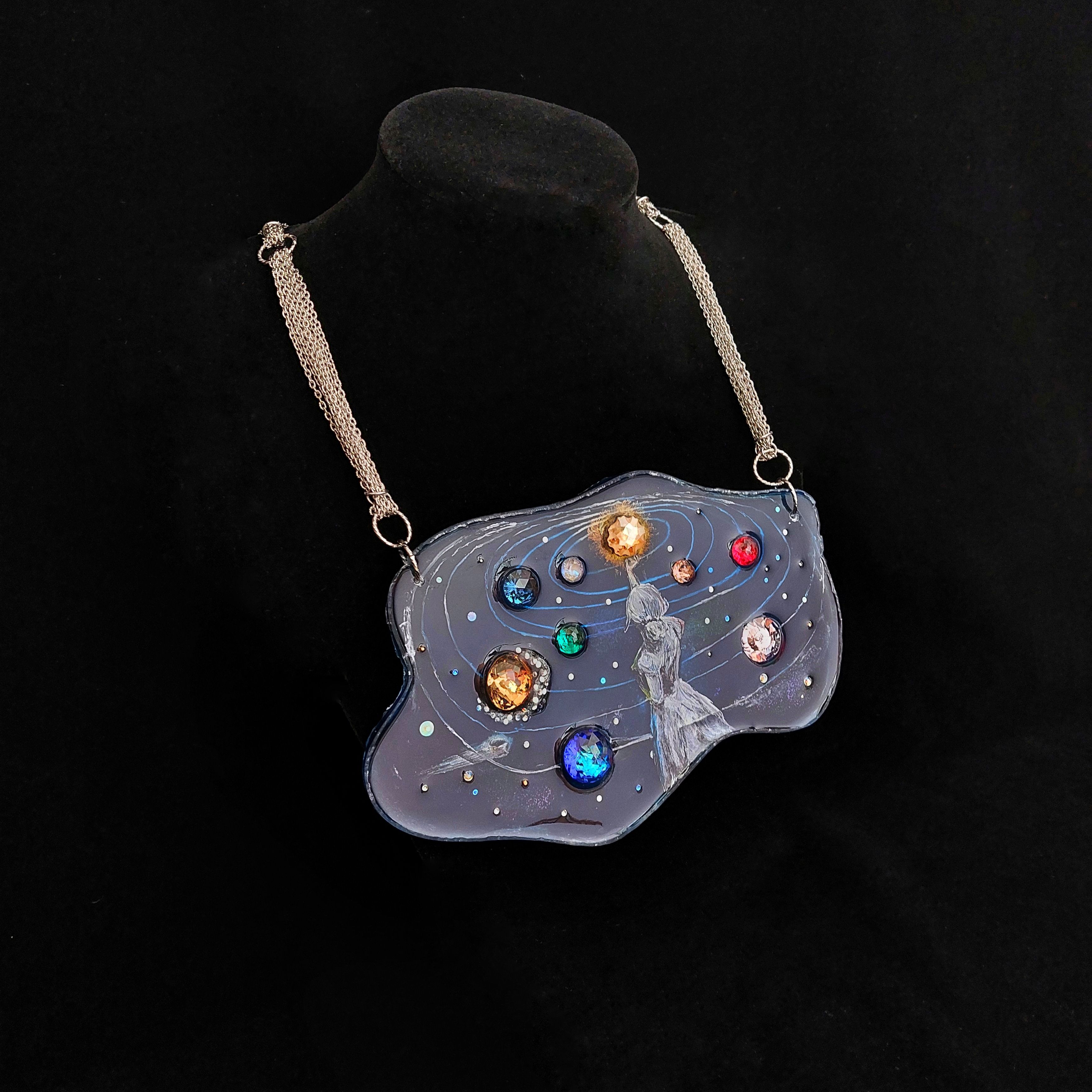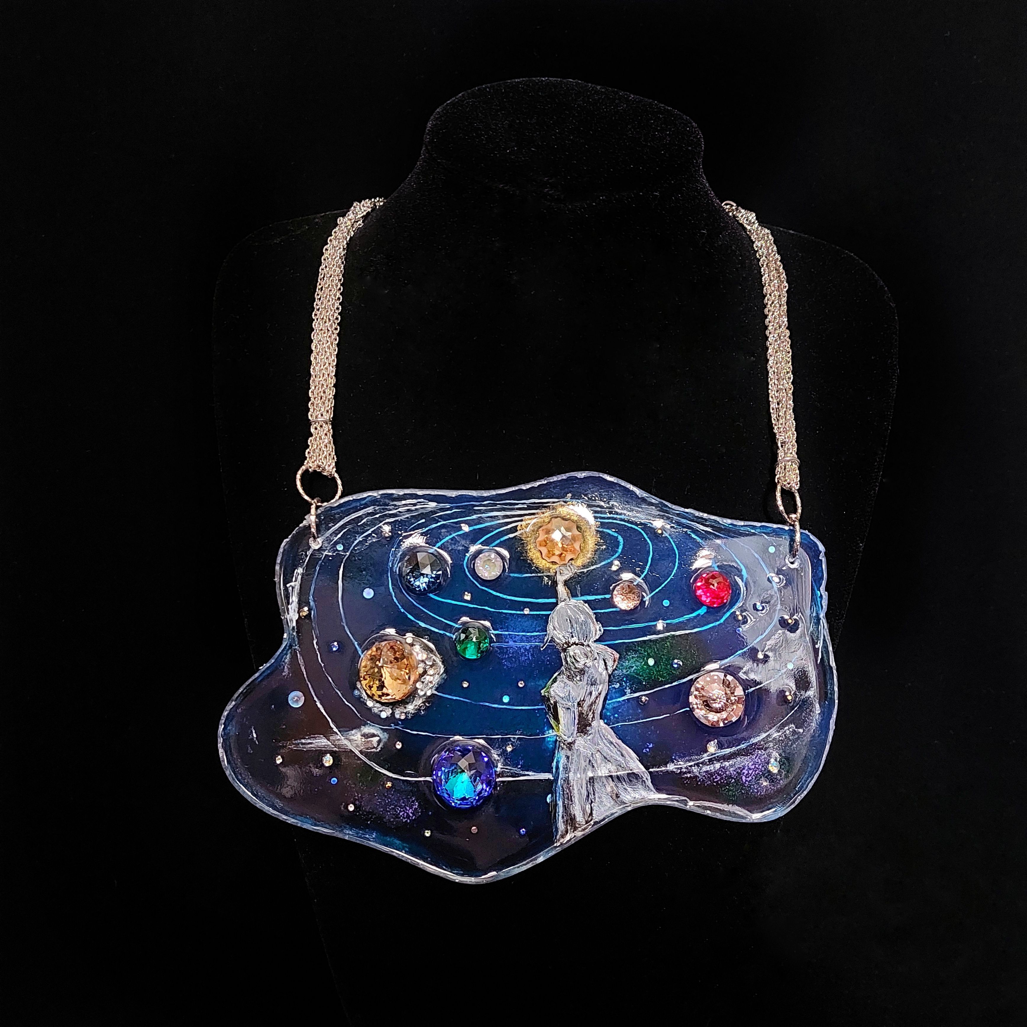 Основная часть колье выполнена методом послойной росписи по эпоксидной смоле. Этот метод дает возможность сделать элементы росписи более объемными. С помощью этого метода я хотела показать глубину космоса, его некую бесконечность.