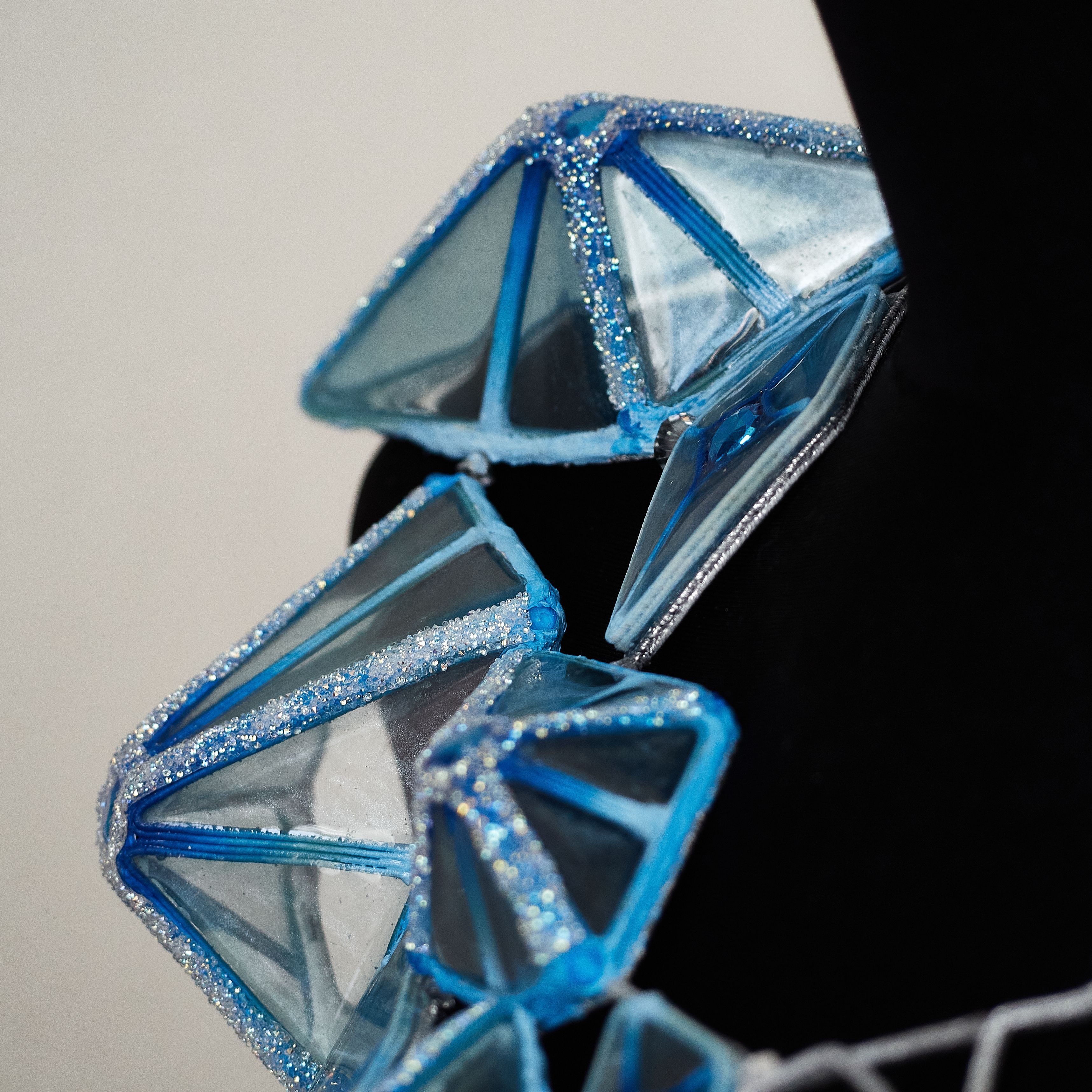 Левая же сторона выполнена в виде разбитых кристаллов с разлетающимися осколками. Каждый осколок на бахроме соответствует недостающему кусочку разбитого кристалла на колье, их можно собирать как мозаику.