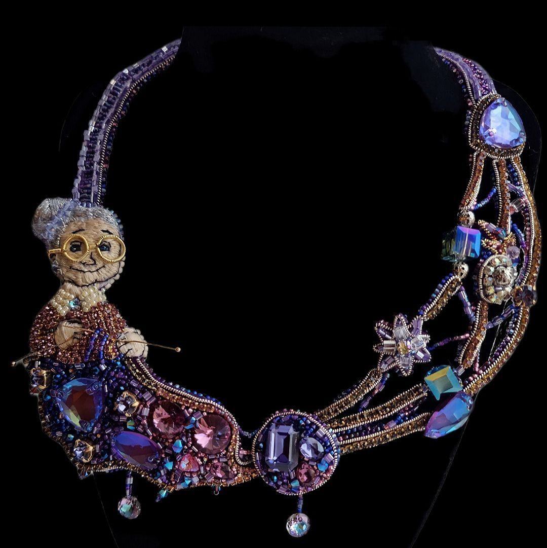 На моём колье изображена милая бабушка, которая вяжет спицами переливающееся всеми гранями кристаллов полотно Вселенной.Из клубка бесконечности выпускаются мерцающие нити, уходящие в глубину миров, переплетая между собой человеческие судьбы, временные эпохи и события. Своими руками бабушка выстраивает по задуманному ей плану планеты, наводит порядок и упорядочивает хаос. На её лице играет милая, непринуждённая улыбка, ведь только ей известны ответы на волнующие тысячелетиями человечество вопросы. Она видела зарождение жизни и именно она связала первую петлю, давшую начало Вселенной.