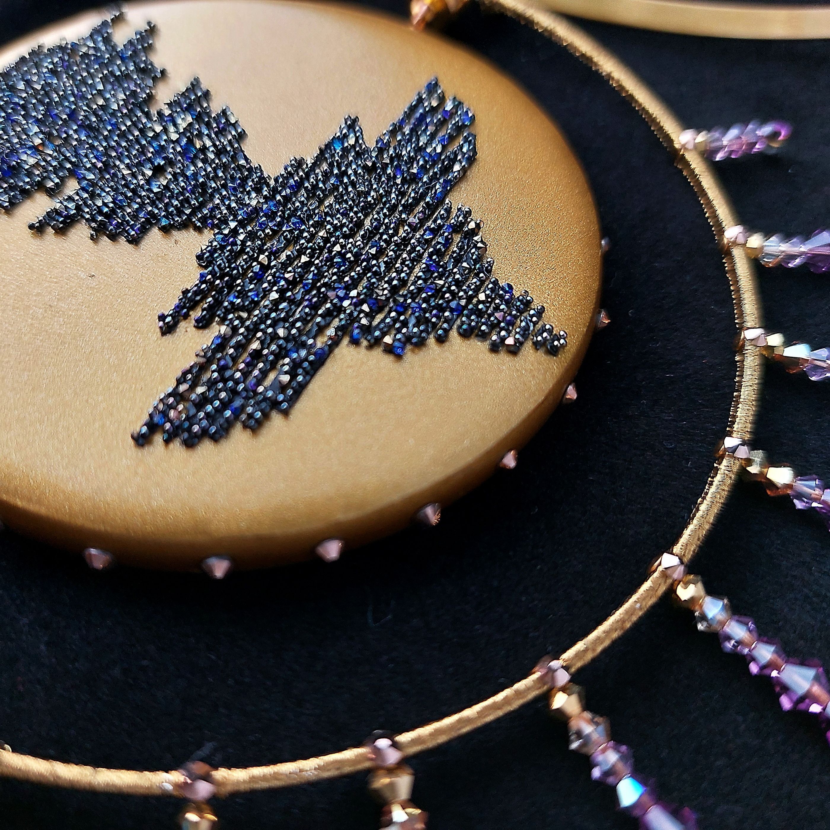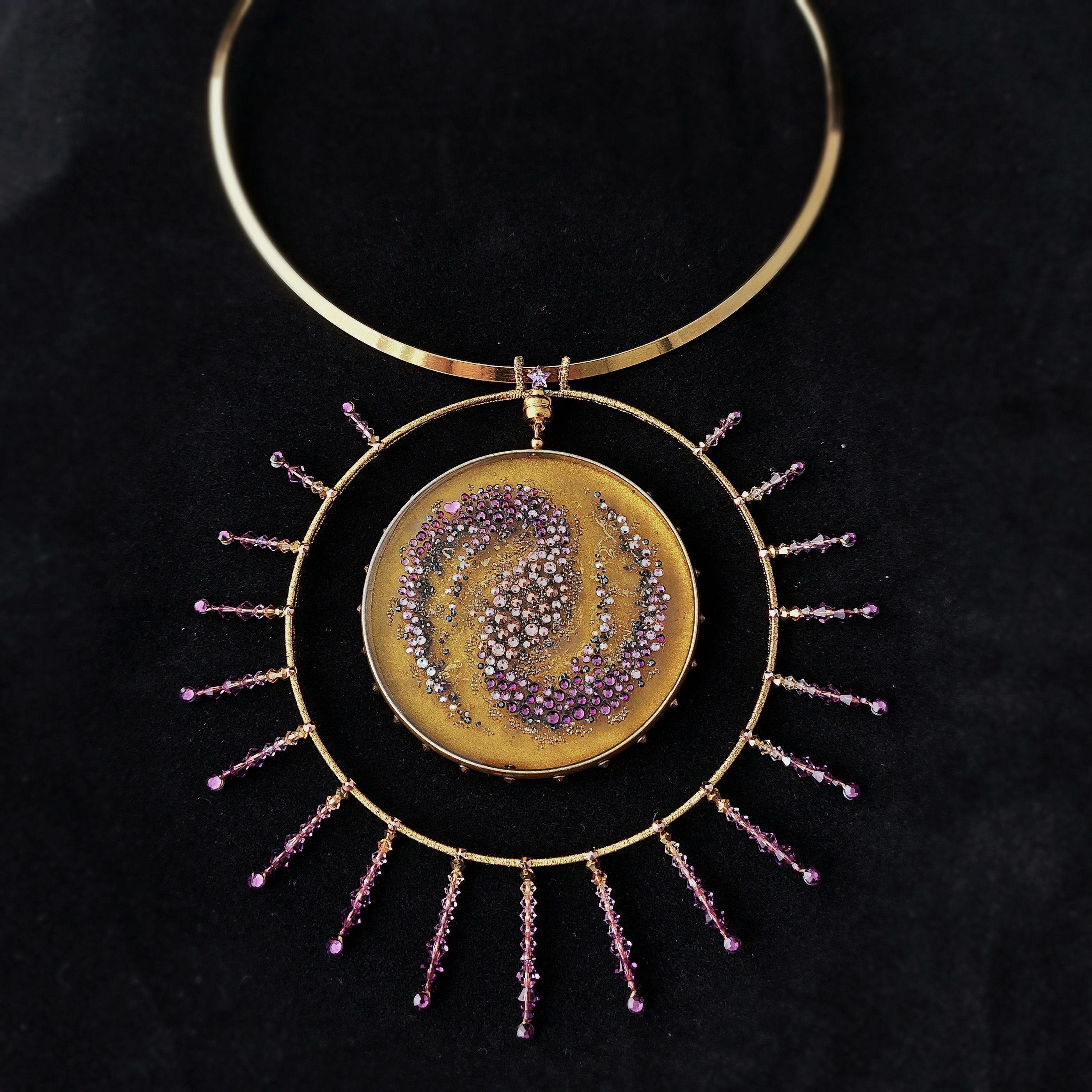 В конкурсном колье главным элементом является своеобразная золотая пластинка с фразой «Я тебя люблю», изображенной в виде графической звуковой дорожки. Мое «Письмо во Вселенную» не улетит к внеземным цивилизациям. Оно адресовано другой Вселенной – Вселенной мастеров Evoli, где каждый Мастер является яркой звездой, способной своим творчеством сказать «Я тебя люблю!» всему миру. Изображение этой Вселенной можно увидеть, перевернув центральный элемент колье.