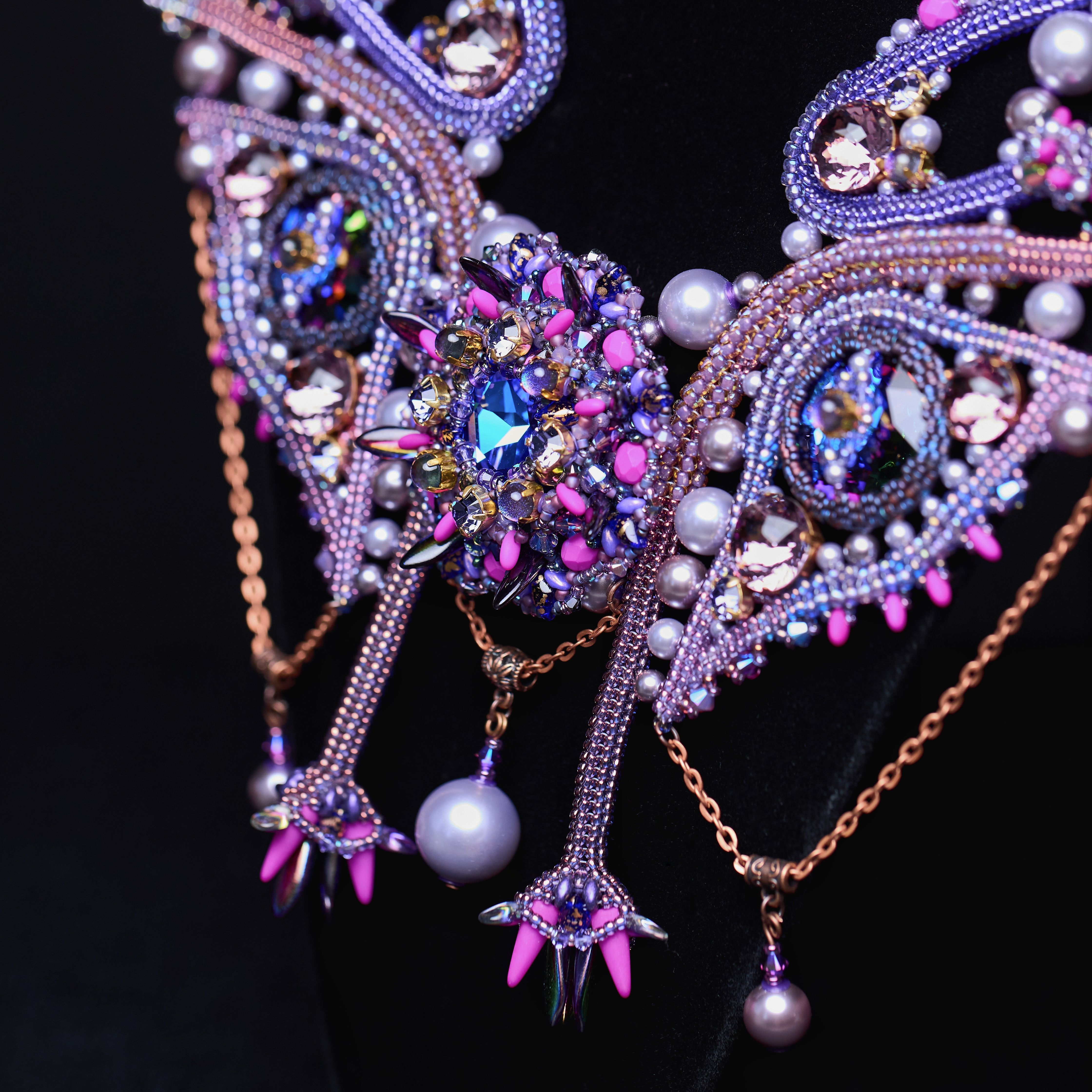 Приобретённый опыт позволяет создавать абсолютно немыслимые метаморфозы в моем внутреннем мире. Каков мой ментальный третий глаз? Он словно многоцветные фракталы, воспроизводящие сами себя в бесконечность. Эти формы, потоки спиралей и цветов отразились в центральном элементе моей работы. Симметрия глаз как органов зрения воплощена в боковых элементах. Потому что невозможно видеть шире и глубже, если нет способности видеть этот мир во всей своей живости и уникальности.