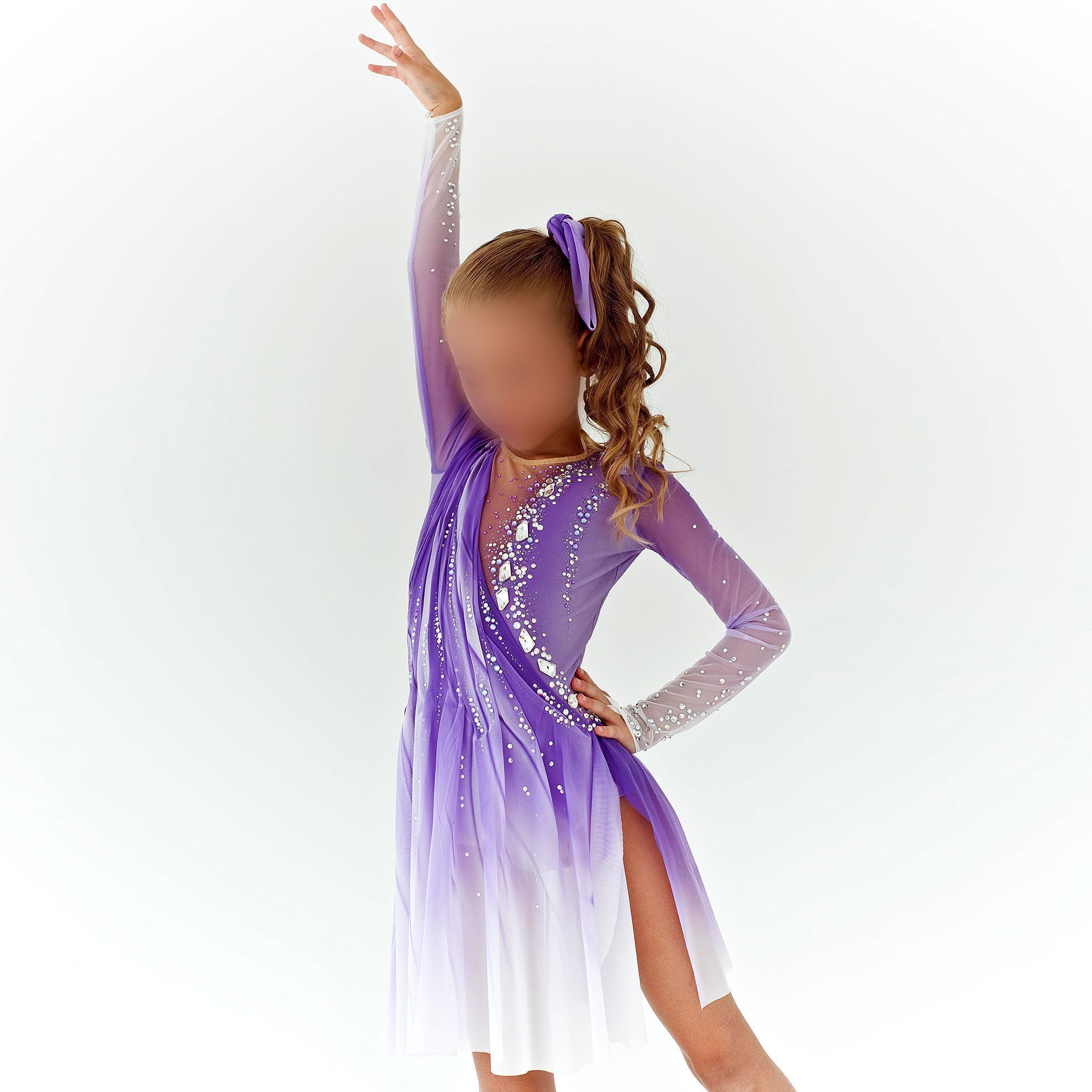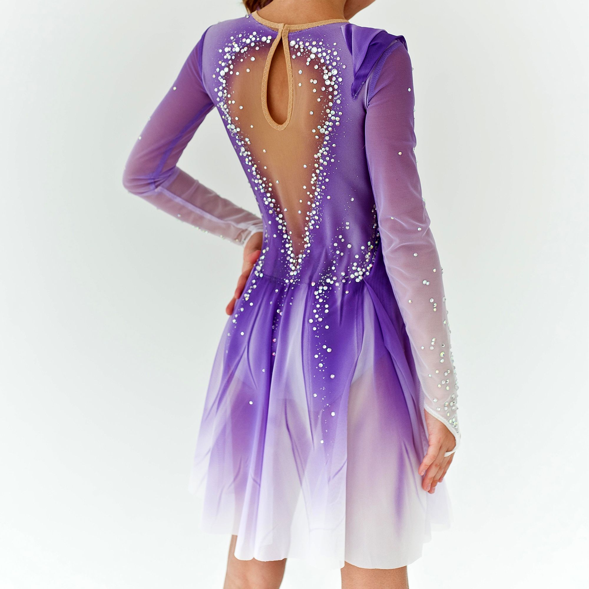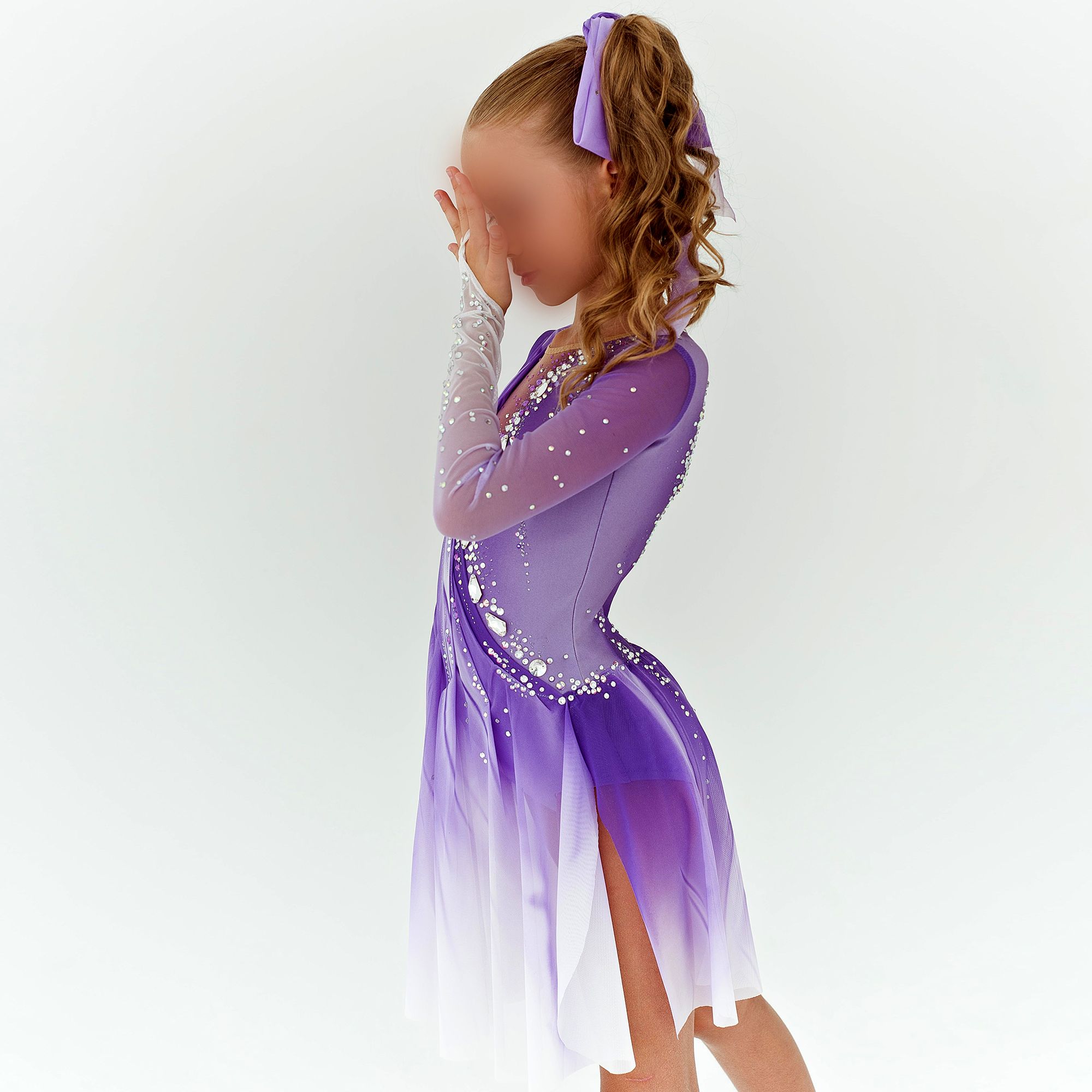 Невероятный мир  .evoli  наполненный  оттенками от светло-сиреневого до темно-фиолетового вдохновили меня на создание платья для маленькой фигуристки.  Хрупкая и изящная, она порхает по льду как будто в невесомости, и кажется, что она растворяется в музыке и пространстве. Нежные переливы оттенков подчеркивает сияние страз.  Словно нежный  лепесток плывет по воздуху, завораживает нас и погружает в невероятную вселенную .evoli . Вселенную красоты, сияния, творчества.