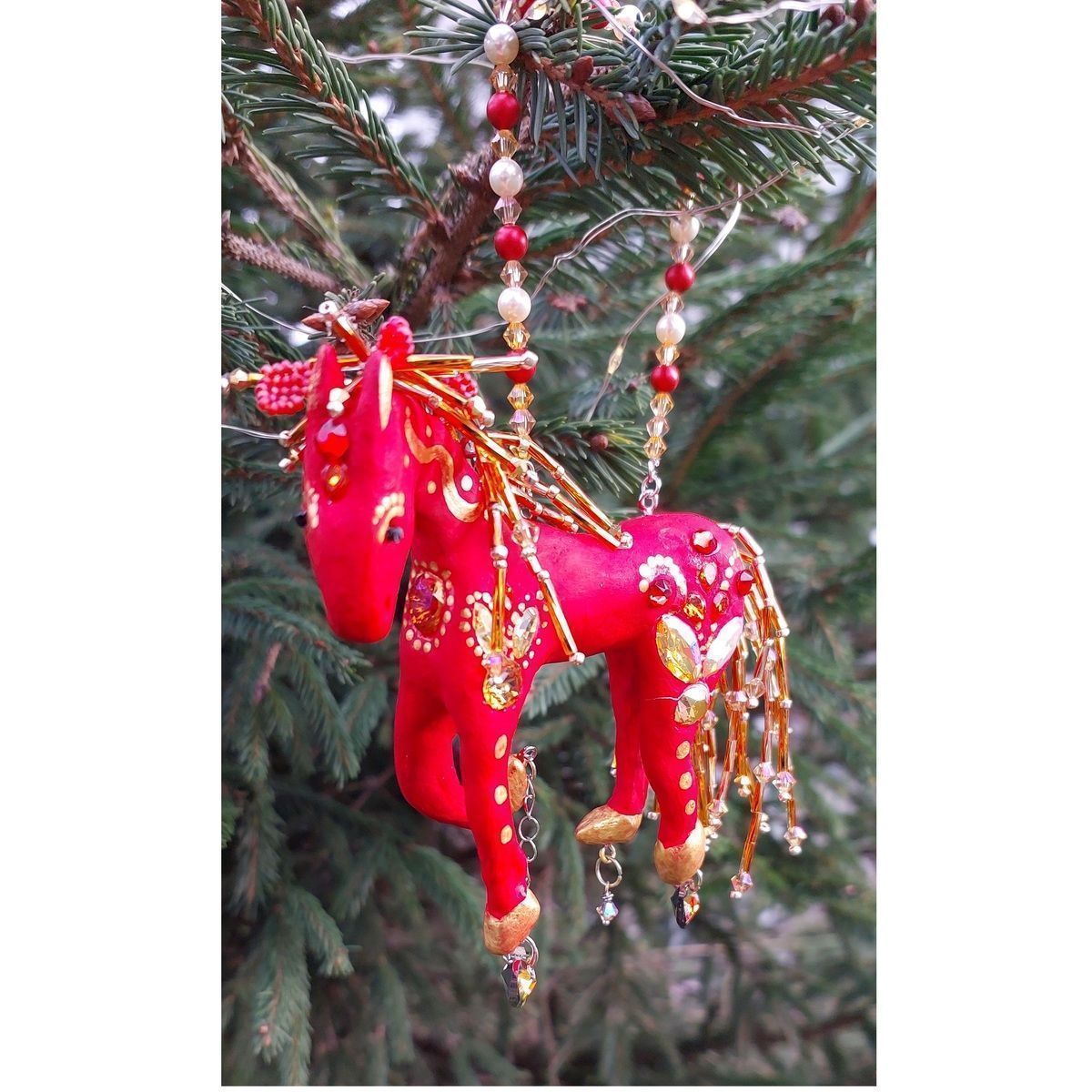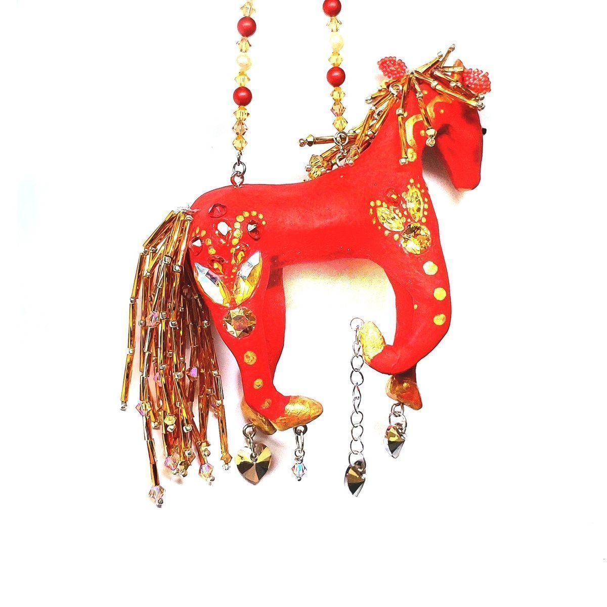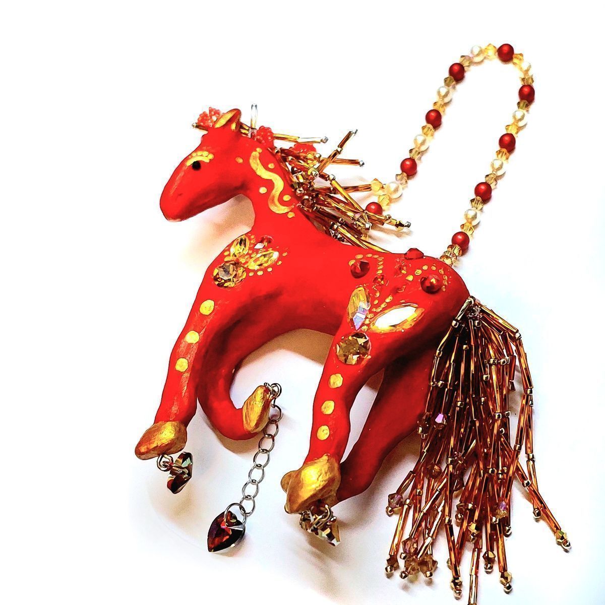 В этом году я решила создать яркую, праздничную фигурку лошади - символ наступающего Ногового года. Красный цвет приносит удачу, а золотой здоровье и достаток. Именно этого я хочу пожелать всем в наступающем Новом году. Работала в новой для себя технике - скульптурирование из самозатвердевающей глины. Каркас лошадки из проволоки. Кристаллы являются здесь частью игрушки, грива и хвост выполнены из бисера и биконусов. В гриву вплетены три рябиновых листочка, на удачу. Игрушка расписана акриловыми красками. В работе был полностью использован набор " Сказка зимнего рассвета".