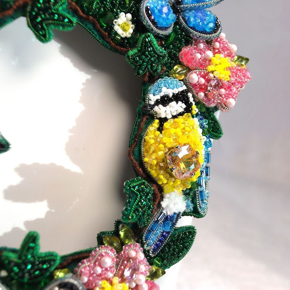 Элементы броши расположены по кругу – символу бесконечности. Данный символ показывает бесконечность развития, жизни и времени. Цветы, птицы и бабочки при создании композиции выбраны не случайно. Розовые первоцветы расцветают первыми, предсказывая приход весны, цветы сирени символизируют рассвет любви, бабочка – душу, бессмертие и возрождение. Птица же – знак свободы и счастья.