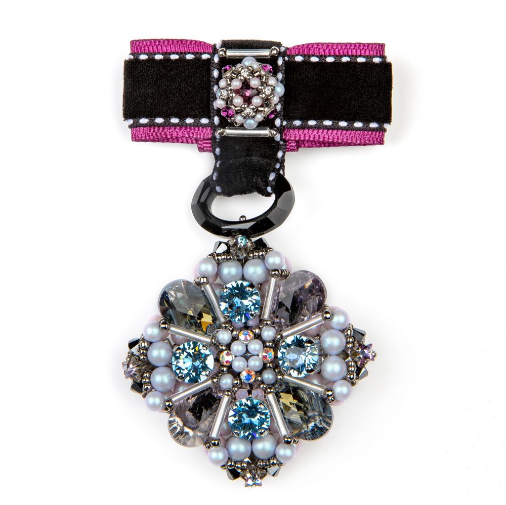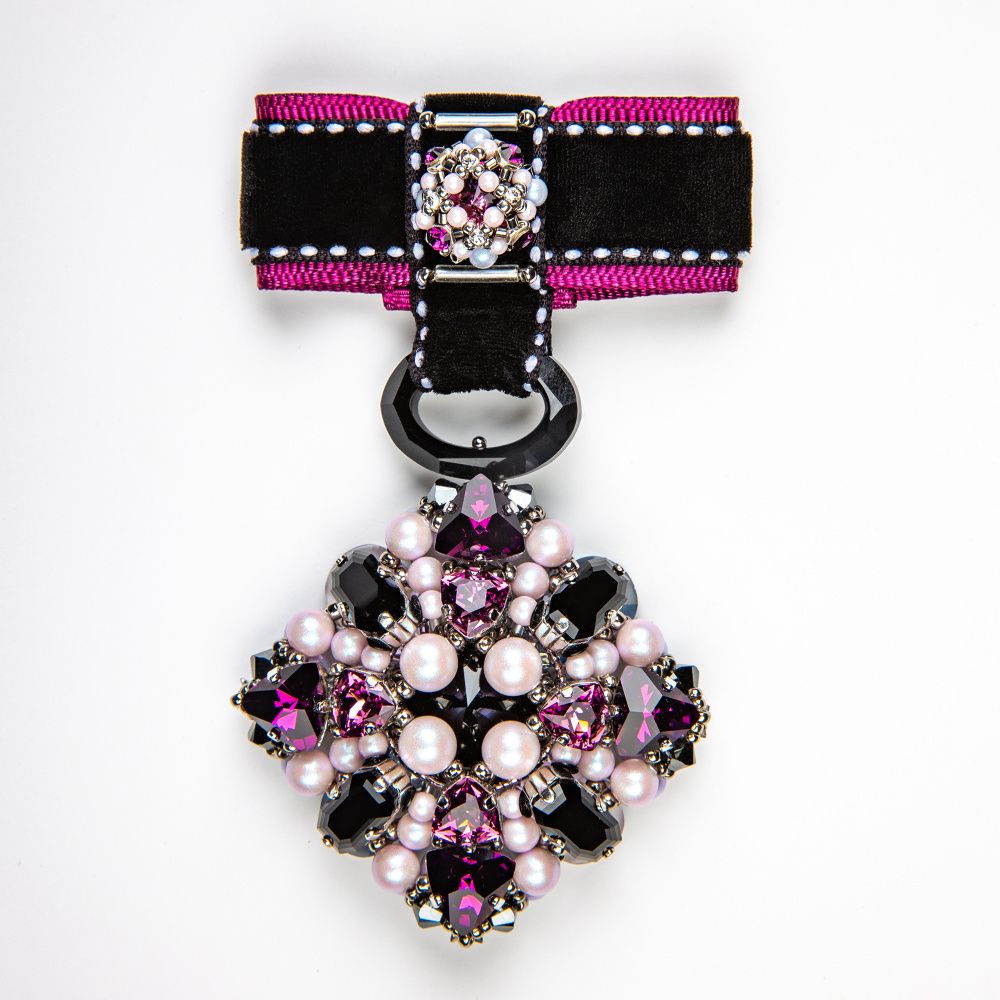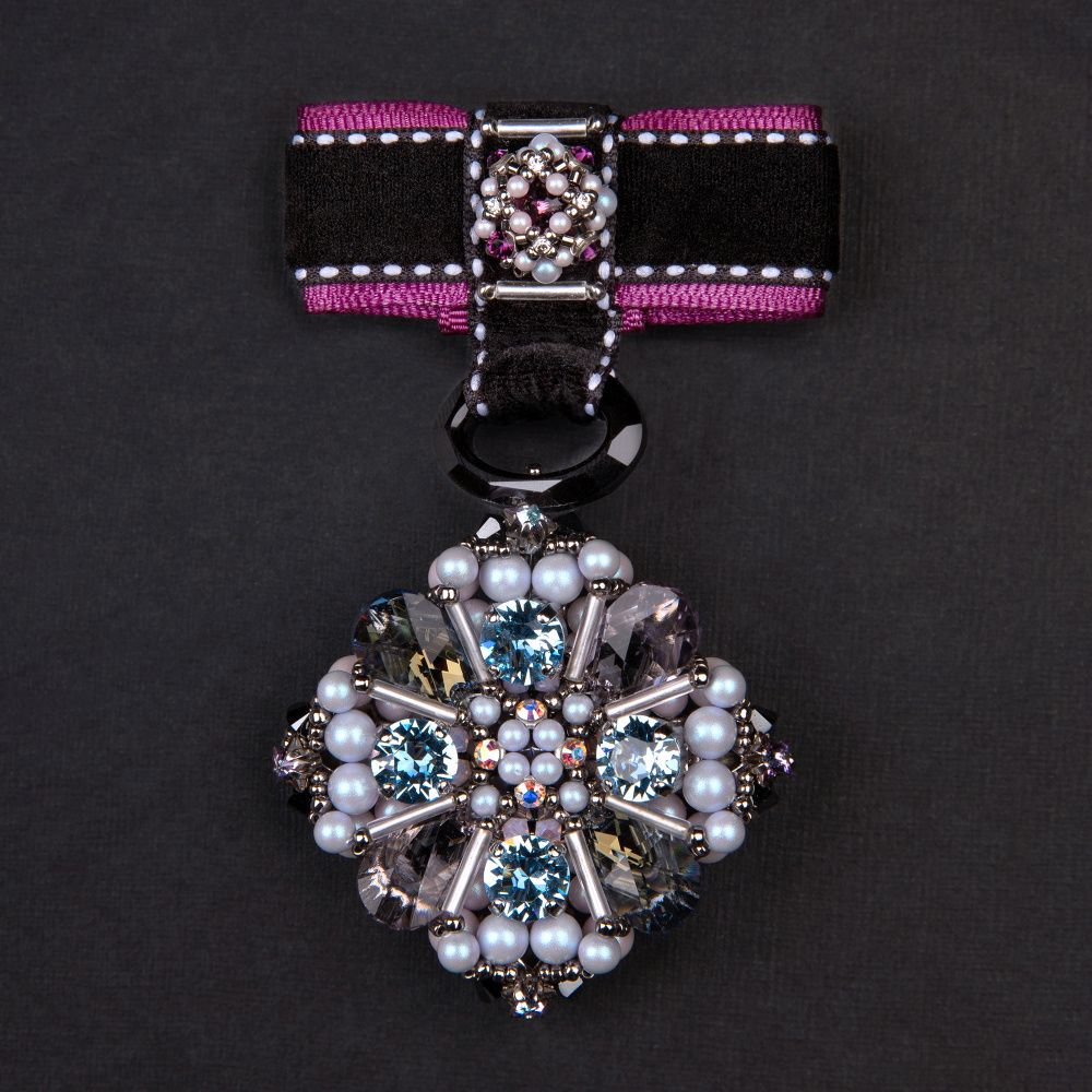 Орден выполнен в технике бескаркасного бисероплетения, а вдохновением для этой работы послужили непревзойденные цвета жемчуга и элегантные формы кристаллов Swarovski.