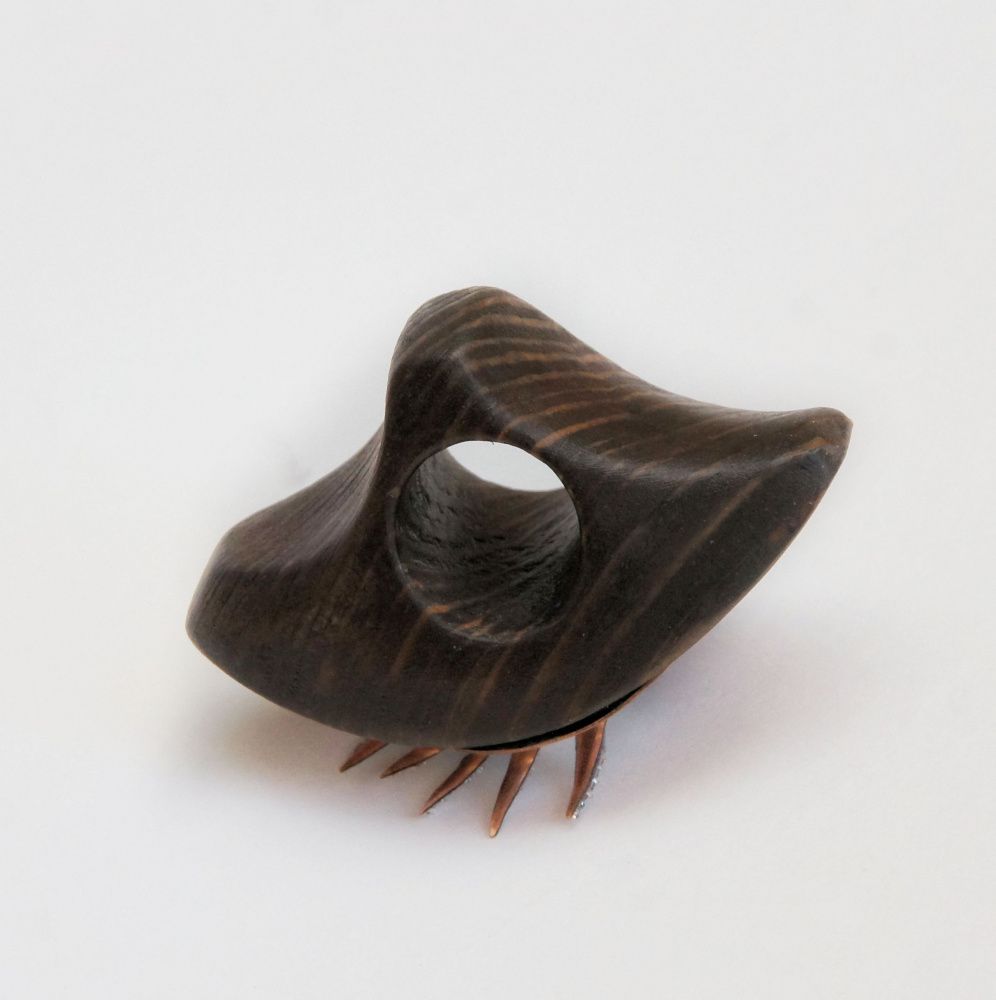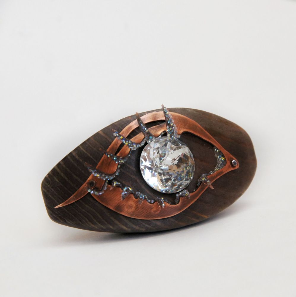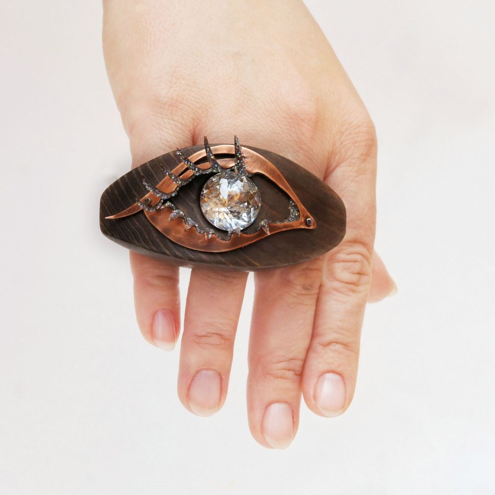 Идея открытия Третьего глаза была воплощена в коктейльном кольце. Крупное основание кольца необычной формы завершается гладкой выпуклой поверхностью, на которой проступают утонченные очертания глаза. По контрасту с природным теплым материалом (древесиной) и "текучими" изгибами основания силуэт Глаза выполнен из металла (меди) и сочетает в себе плавные линии контура с тонкими острыми длинными ресницами. С внутренней стороны ресницы и веки задекорированы кристальной тканью swarovski. Центром композиции является зрачок - крупный (18 мм) круглый кристалл swarovski новой формы Dome round stone. Если всматриваться в него, то создается эффект погружения в неизвестное, сияющее пространство… Глаз как-бы распахивается навстречу смотрящему, призывая заглянуть в неизведанное, увидеть новые грани мира.