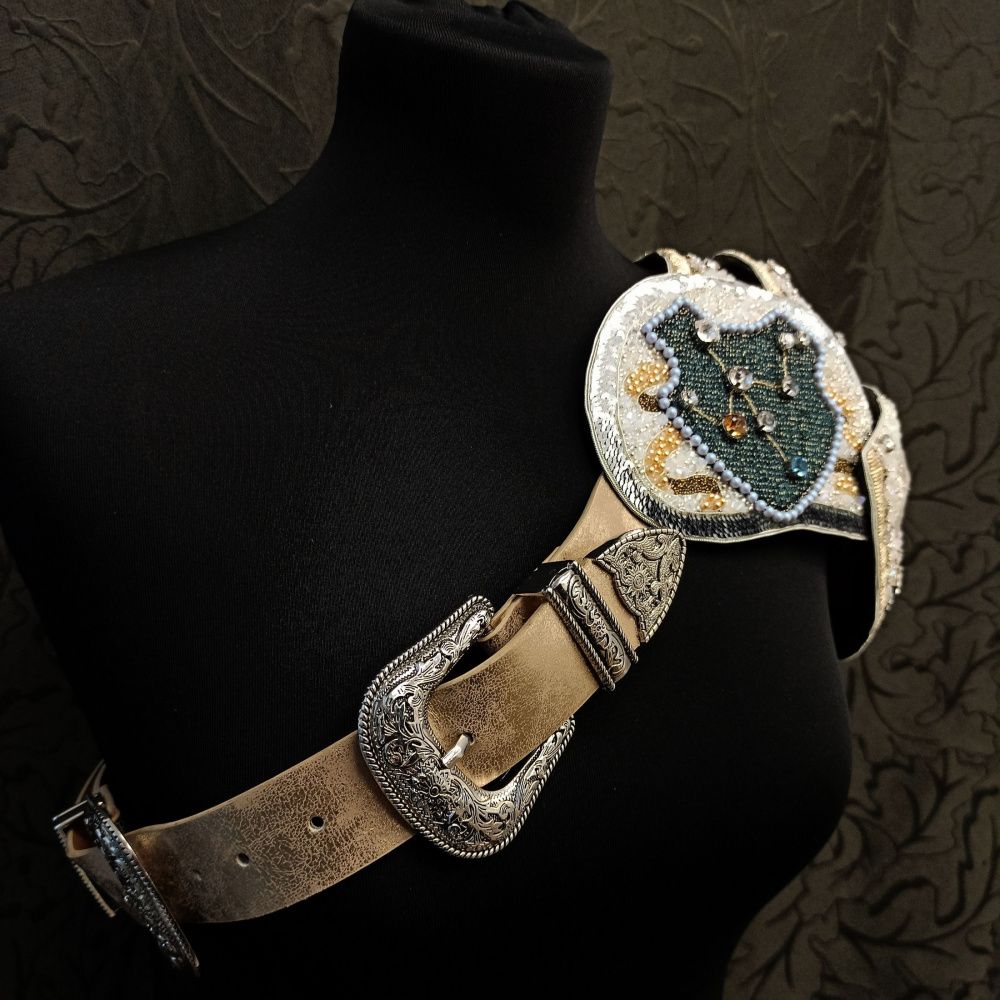 Я максимально постаралась сохранить форму наплечника готического немецкого доспеха. Все части скреплены штифтами и относительно подвижны.