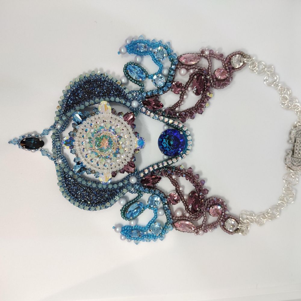 Колье выполнено в технике плетения ндебеле. Основным элементов в колье является кристалл Dome Crystal AB в размере 18 мм из коллекции «Время сиять». Невероятное количество граней дает ему особое свечение. Кристалл без фольгированного покрытия создает эффект призмы и Dome открывается для нас своими «новыми гранями сияния». В динамике элемент напоминает фейерверк (так появилось название конкурсной работы). Остальные элементы дополняют центральную часть, напоминая нам о падающих искрах фейерверков. Темные элементы украшения символизируют ночное небо, благодаря которому мы можем наблюдать всю красоту фейерверка. Конкурс посвящен 125-летию Swarovski, а праздник без фейерверка не праздник.