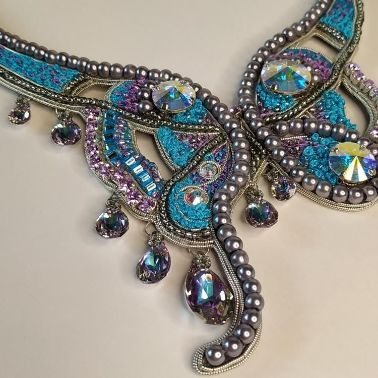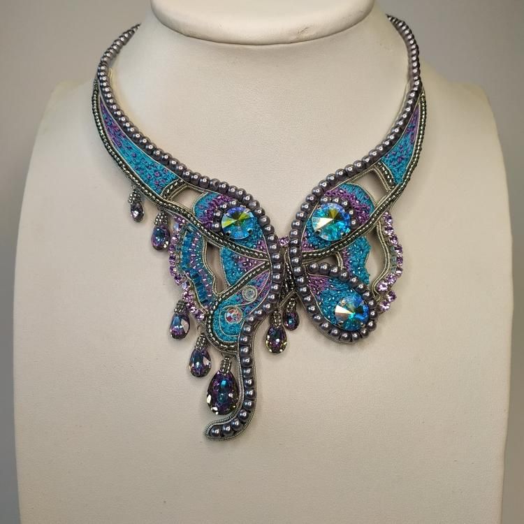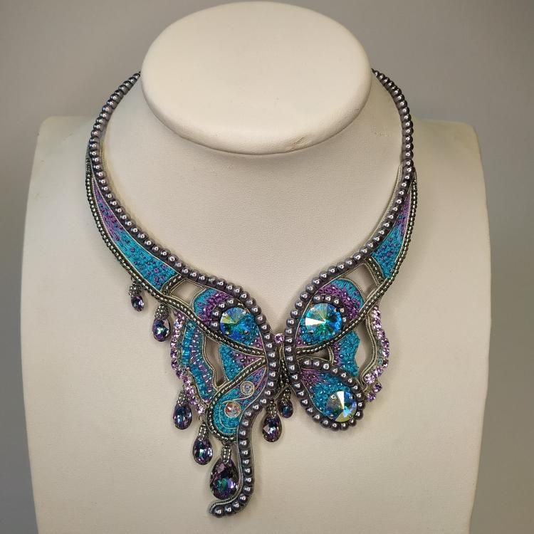 Идея создать именно ее родилась спонтанно, когда сидя на берегу озера в середине августа, я увидела первую бабочку в этом году. Тон всего изделия несомненно задали кристаллы Pear Cut Pendant Crystal Vitrail Light. Их необыкновенное сияние и переливы цветов никого не оставят равнодушным. Вся палитра и техники работы подбирались таким образом, чтобы подчеркнуть те самые кристаллы.