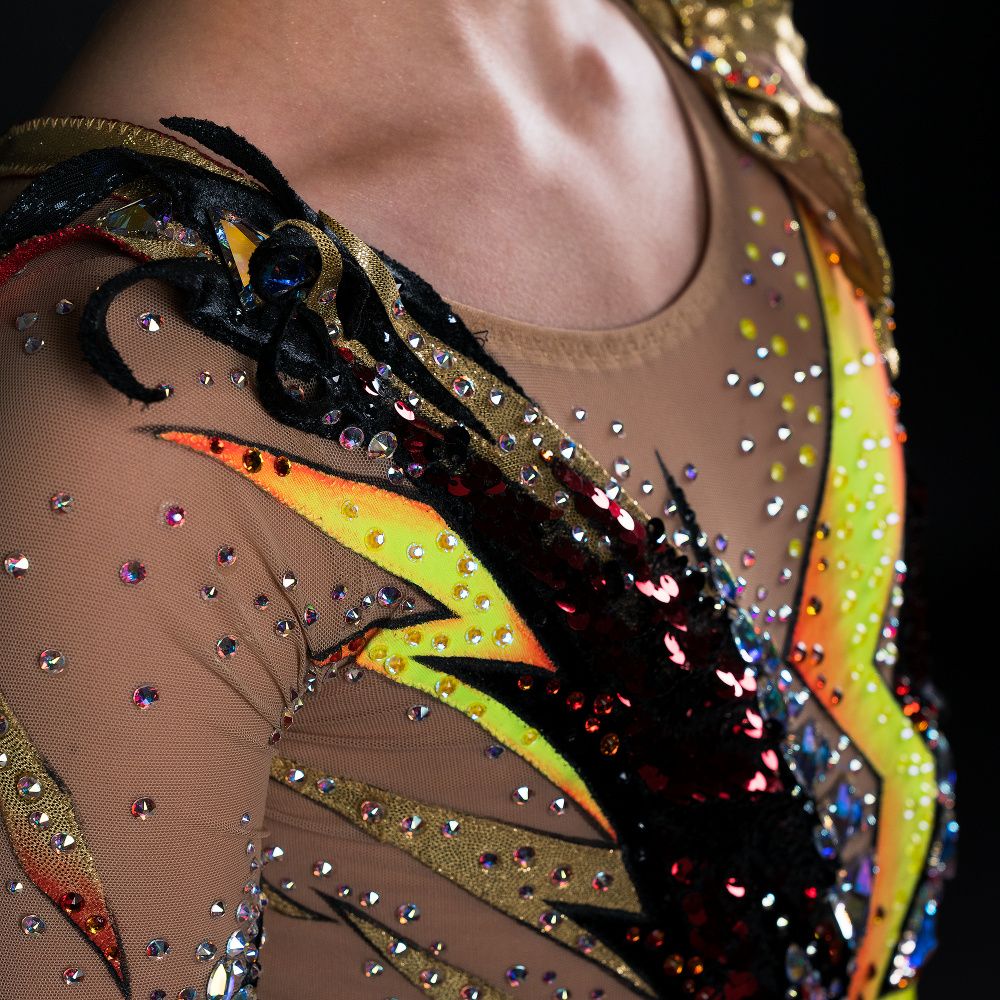 На передней части изделия изображена молния, которая несёт в себе огромный заряд энергии! Энергия даёт импульс ослепительному сиянию и разнообразию контрастных красок. Элементы на груди из чёрного блестящего бархата с чёрно-красными пайетками символизируют догорающее, но в любой момент с дуновением ветра возобновляющимся пламенем. Блеск золотой и красной голографической ткани дополняют этот образ. Притягательные искры, рассыпающиеся брызгами, украшают композицию. Используемые в работе пришивные стразы Сваровски помогают наилучшим образом передать сияние этой задумки.
