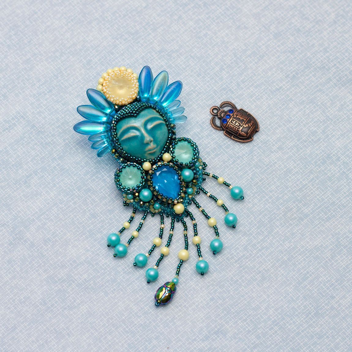 Брошь ХАТХОР - дуэт керамического кабошона и кристалла голубой электрик, который дополнили нежные оттенки желтого, мятного, бирюзового цветов кристаллов и жемчужин.