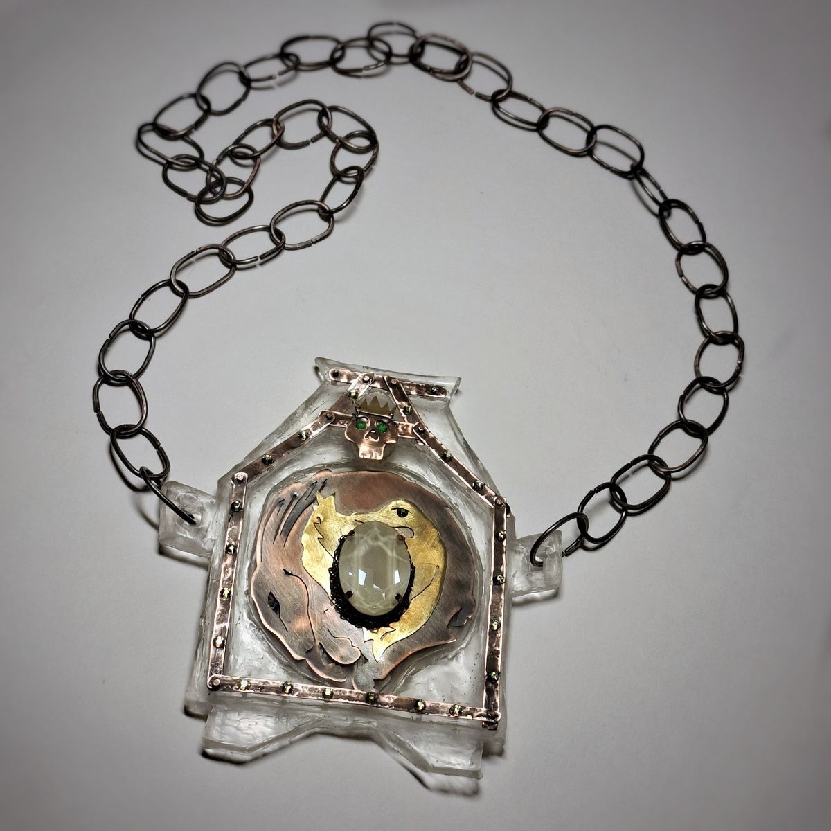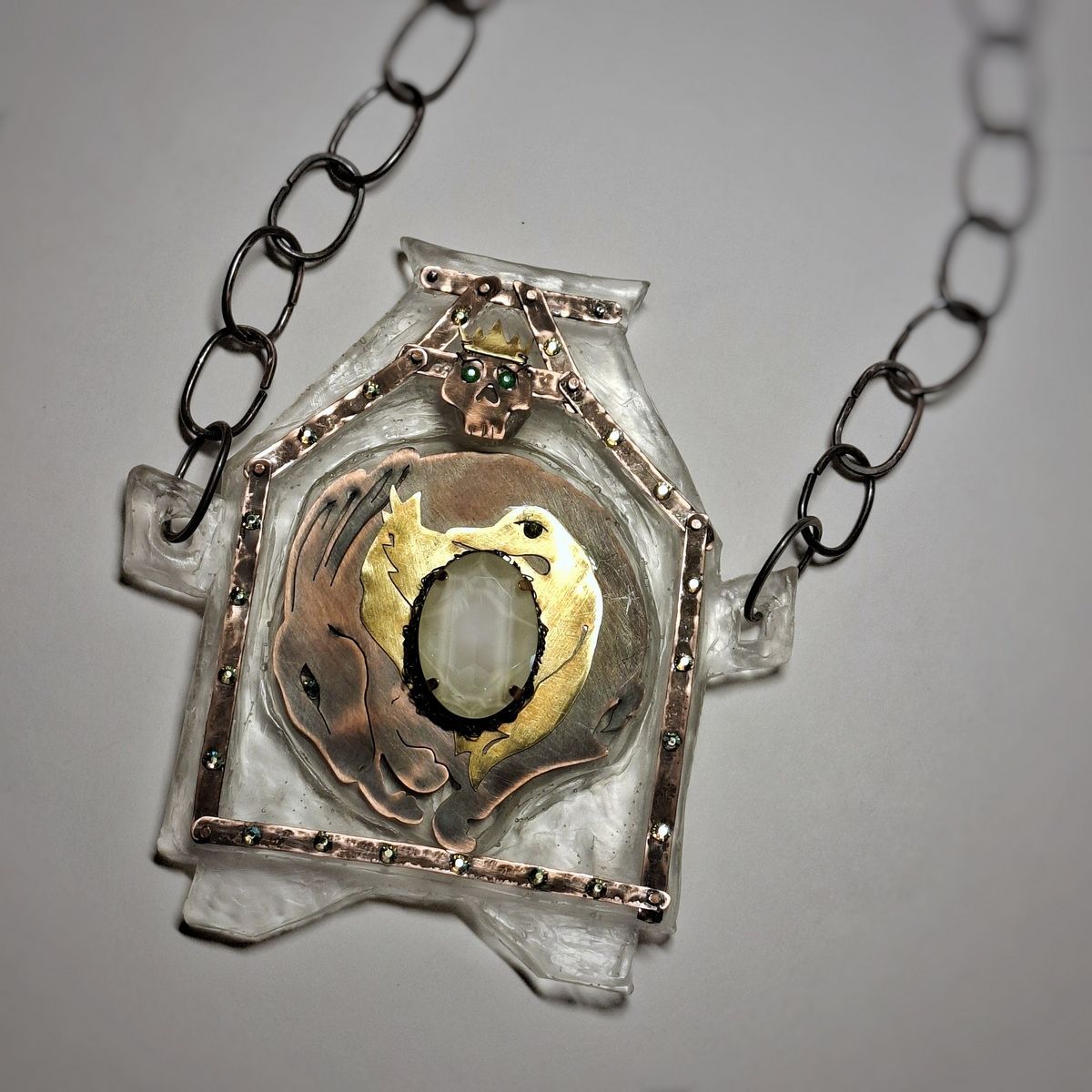 Колье Смерть Кощея выполнено из меди, латуни, эпоксидной смолы, декорировано кристаллами. Цепь сделана вручную из медной проволоки.