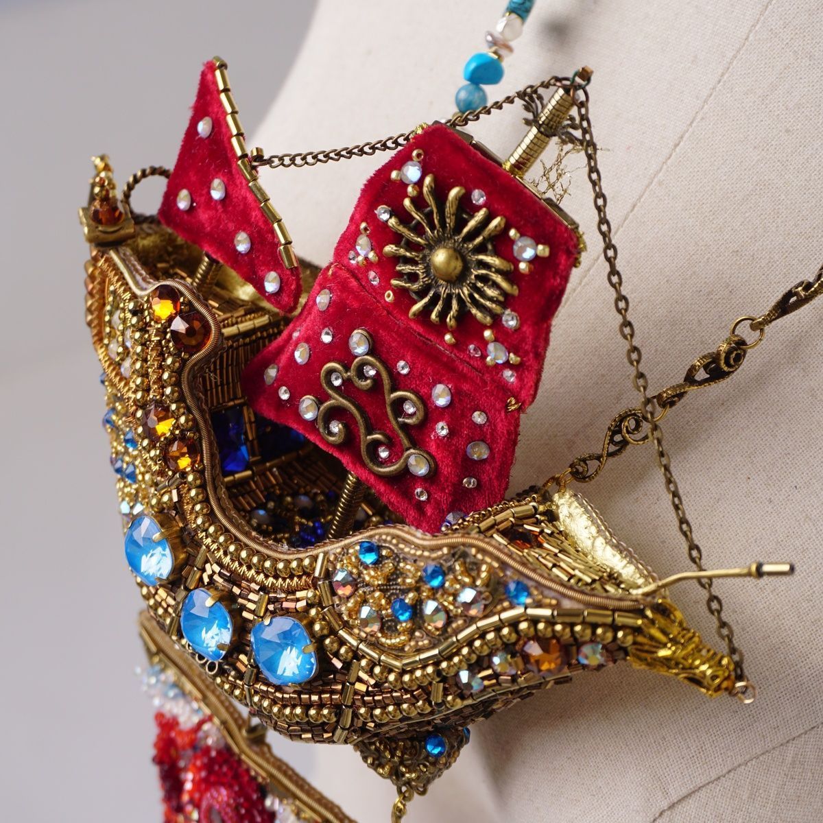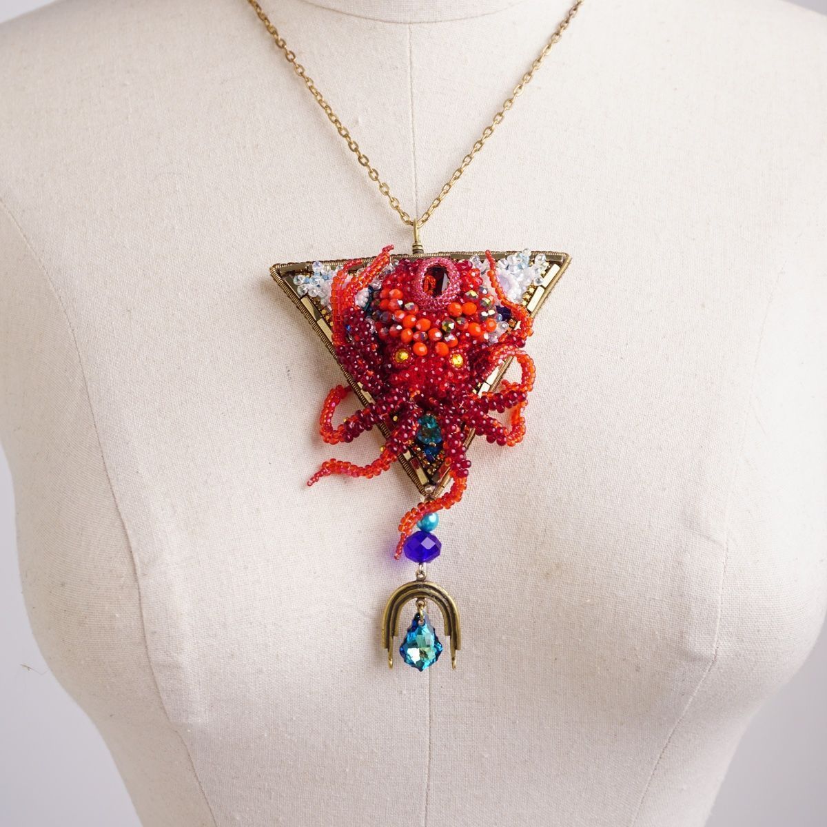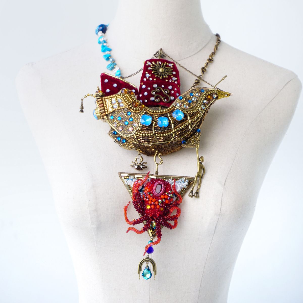 Существует много гипотез, одна из которых легла в сюжет моего колье-трансформера. Согласна легенде, в водах Бермудского треугольника обитает Кракен, который топит корабли, находящиеся рядом с ним.