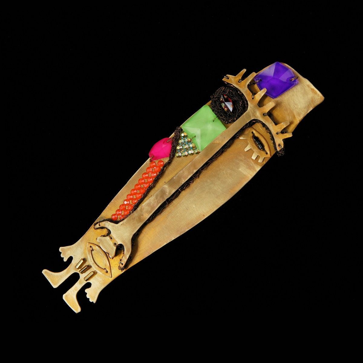 Брошь Anthropomorphicus как бы разделена на 2 части: одна часть приближена к историческому образцу - лаконична и строга, другая часть декорирована кристаллами разных форм и размеров в неоновых ярких цветах - дерзка и вызывающа.