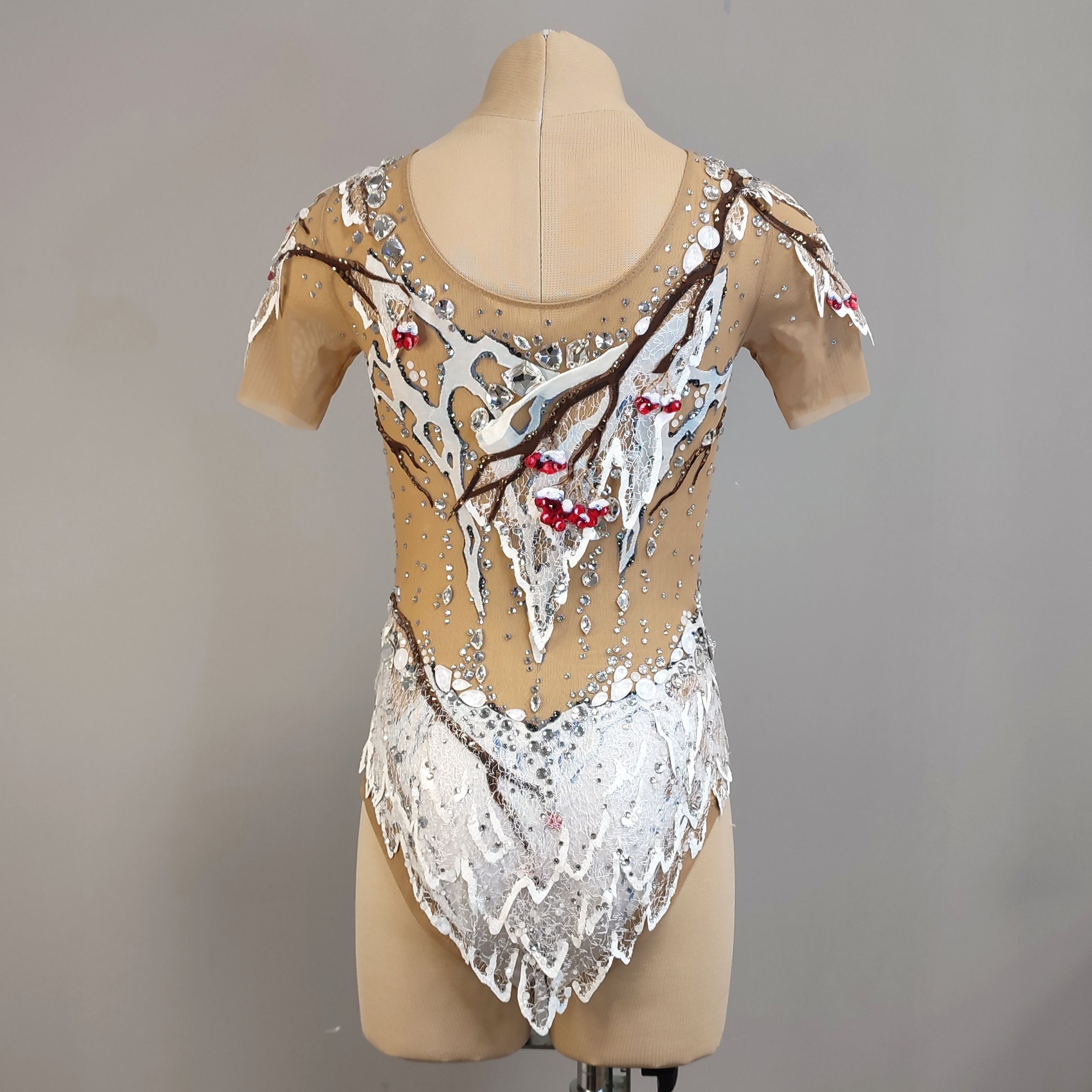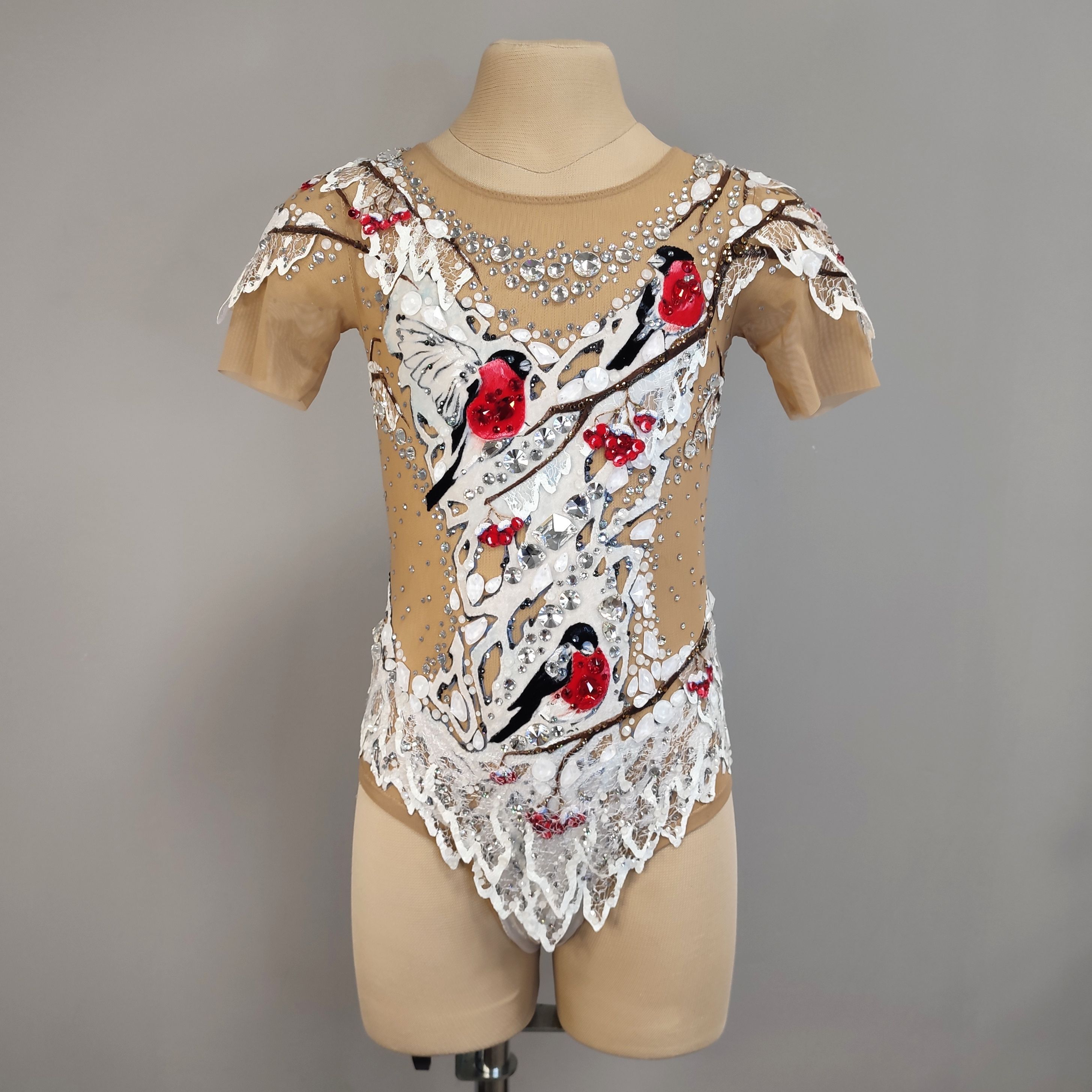 Так и получился этот белоснежный купальник, в центре композиции которого красногрудые птицы. И на каждой грудке вы найдете конкурсные кристаллы.
