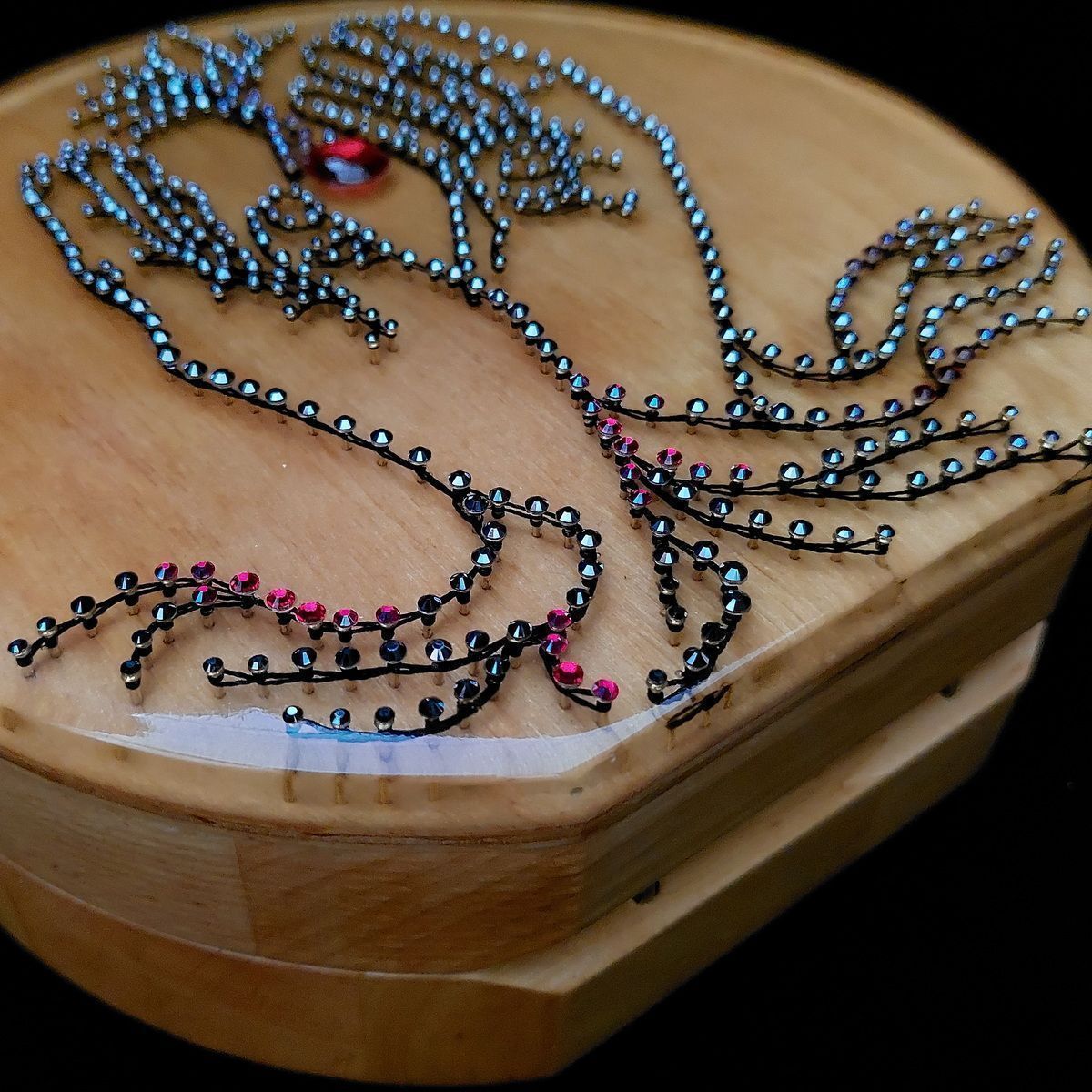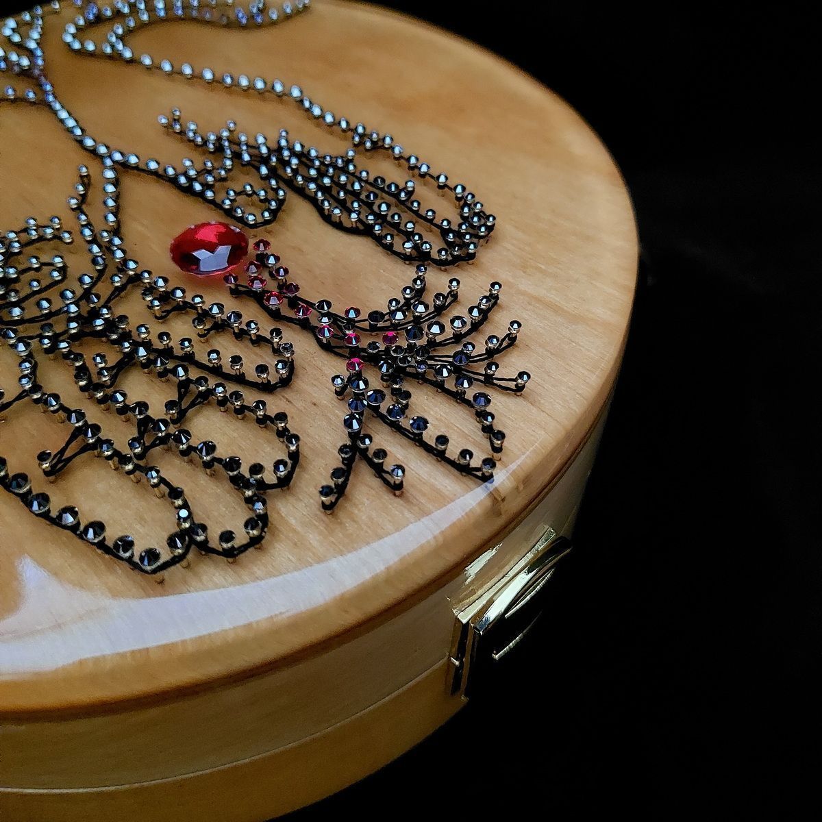 Рисунок для лицевой стороны выполнен в технике стринг-арт и создавался с помощью современных технологий: из фотографии рук при помощи графического редактора я создала чертеж, по которому набила гвозди, а по гвоздям натянула нити. Шляпки гвоздиков украшены кристаллами. Заливка эпоксидной смолой придала рисунку дополнительный визуальный объём. Под центральным кристаллом спрятан светодиод, придающий ему свечение.