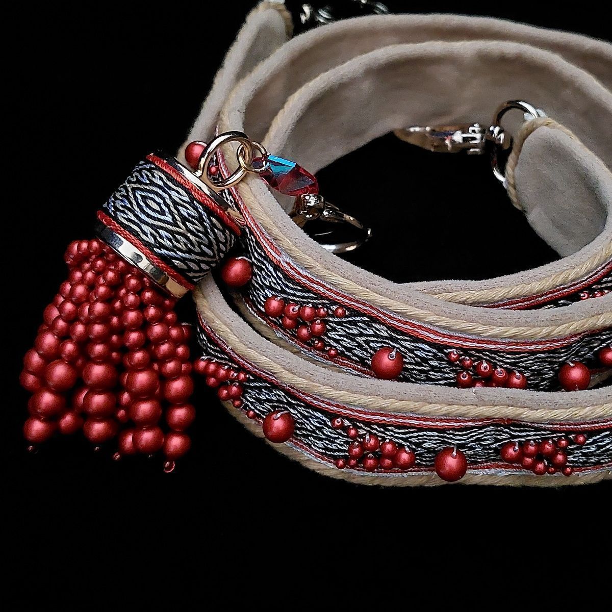 Плечевой ремень выполнен в старинной русской технике поясного ткачества на дощечках. Данный способ я осваивала специально для этой работы, придумав, как вплетать бусины в процессе ткачества.