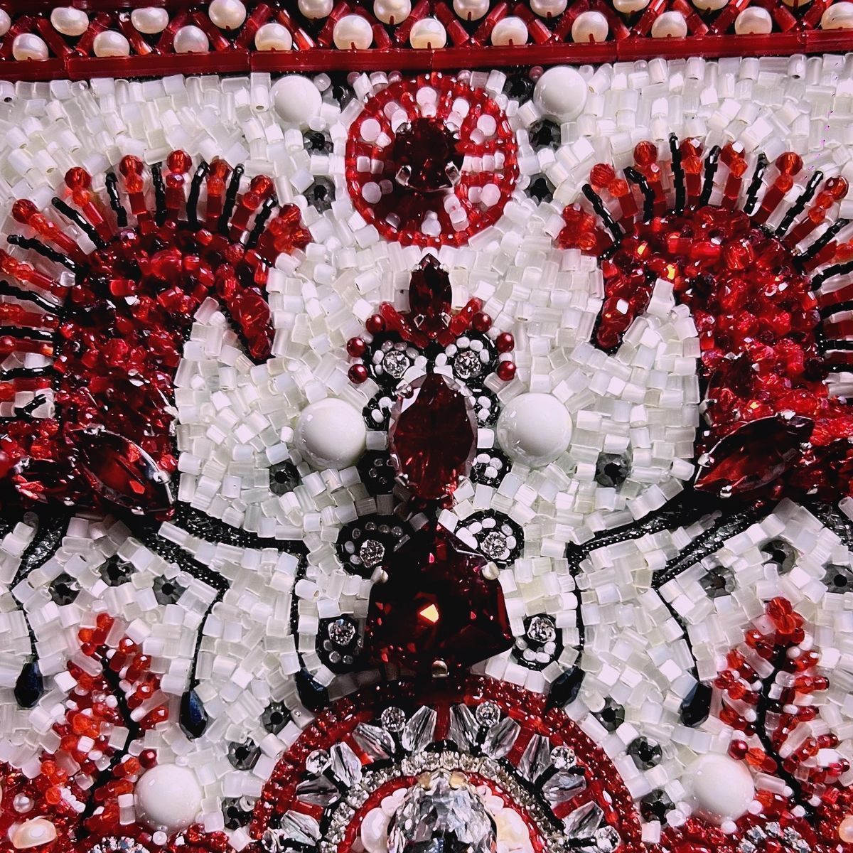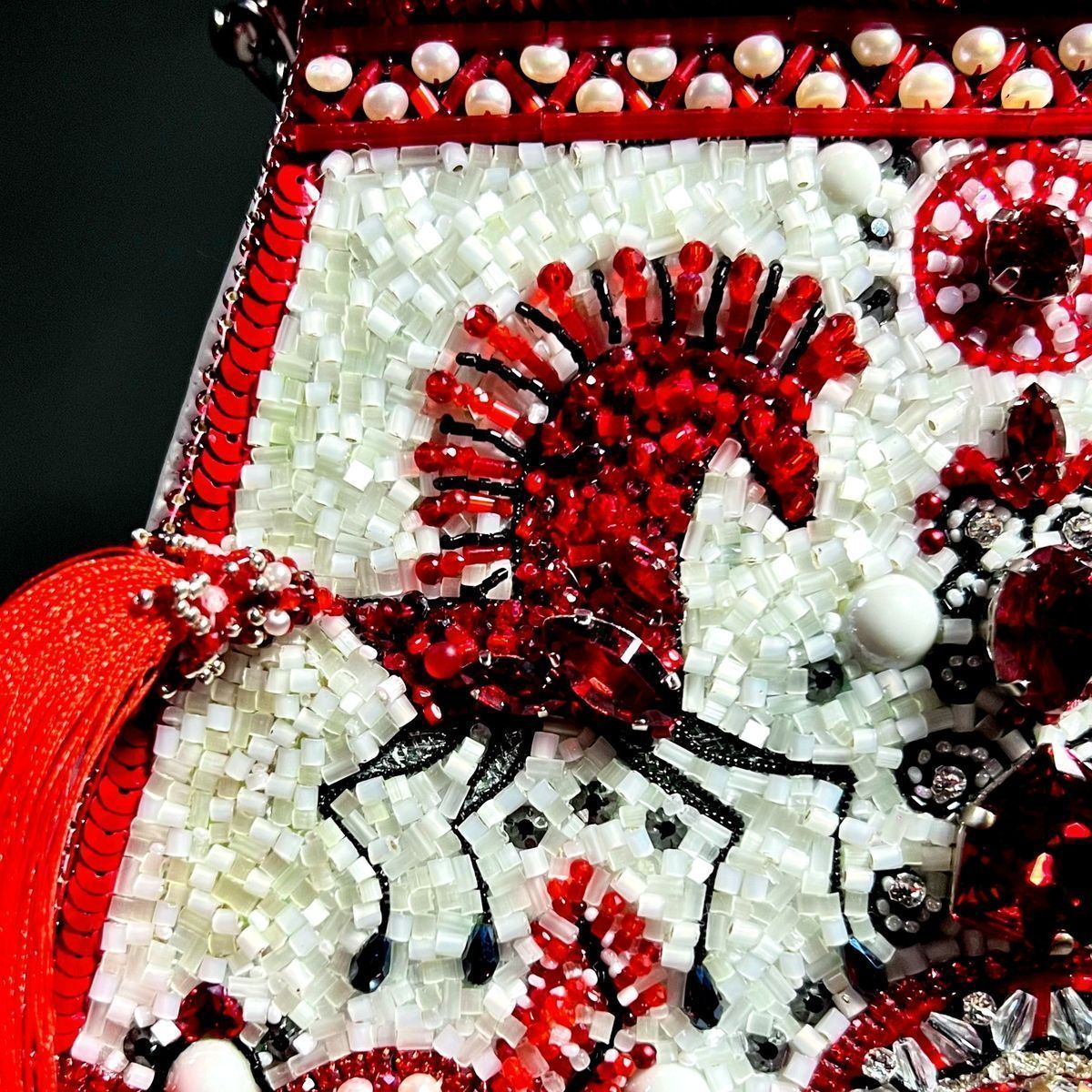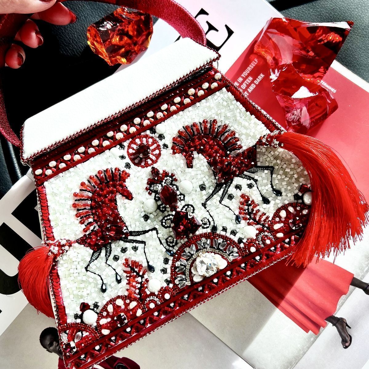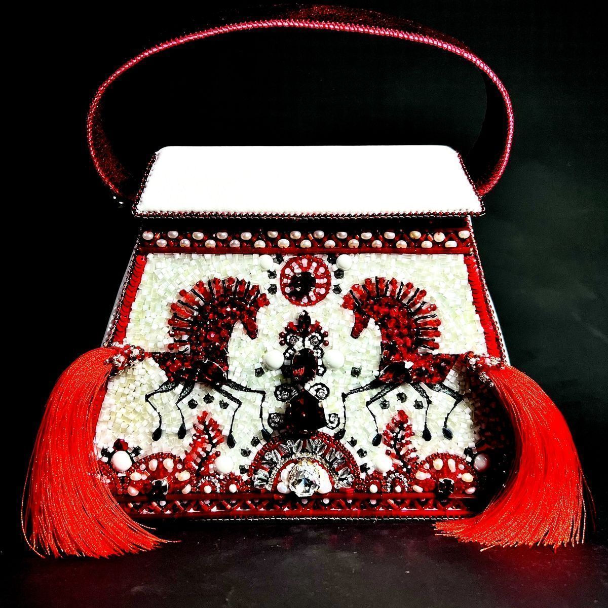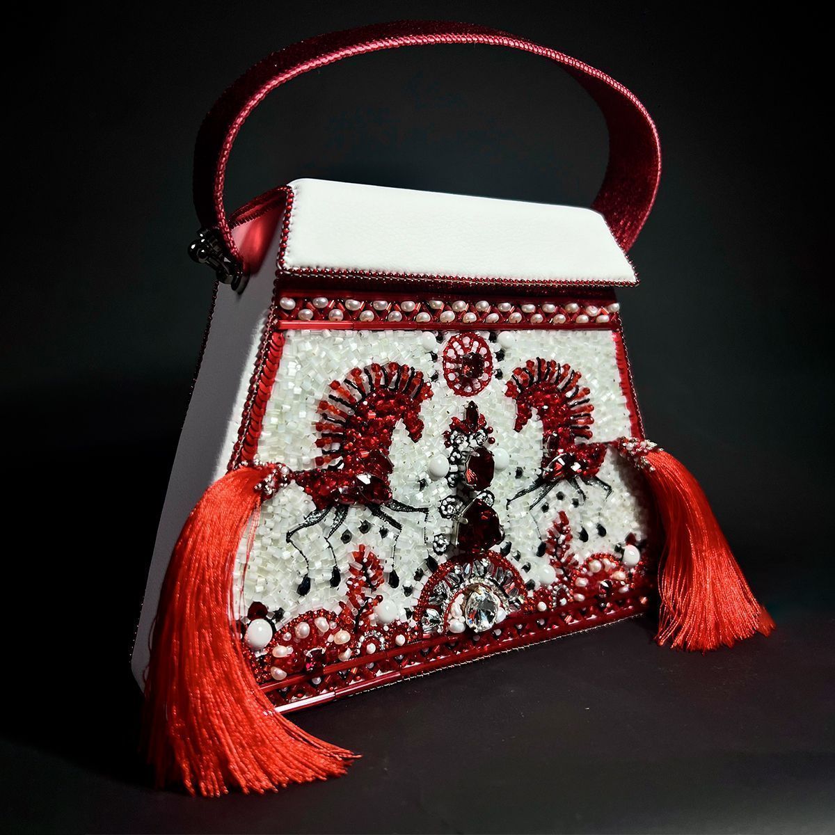 Мезенская роспись нравится мне своей минималистичностью и графичностью, а в сочетании с современными материалами и фактурами она обретает новое прочтение. Цвета и чёткие линии наполняют её чём-то первобытным и воинственным и напоминают мне наскальную живопись, а многоярусность берёт  истоки у шаманизма, добавляя сумке   загадочности и скрытых смыслов. Сумка поделена на три яруса чёткими линиями. На верхнем ярусе изображено небо с жемчужными тучами, на среднем ярусе вышито дерево как центр мироздания и солнце над ним, а по краям два буйных коня. Конь – символ солнца, плодородия, источник всех жизненных благ. Нижний уровень это земля и связь с нижним миром, связь с предками.