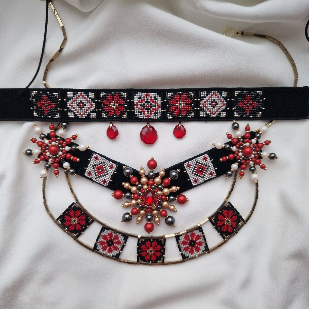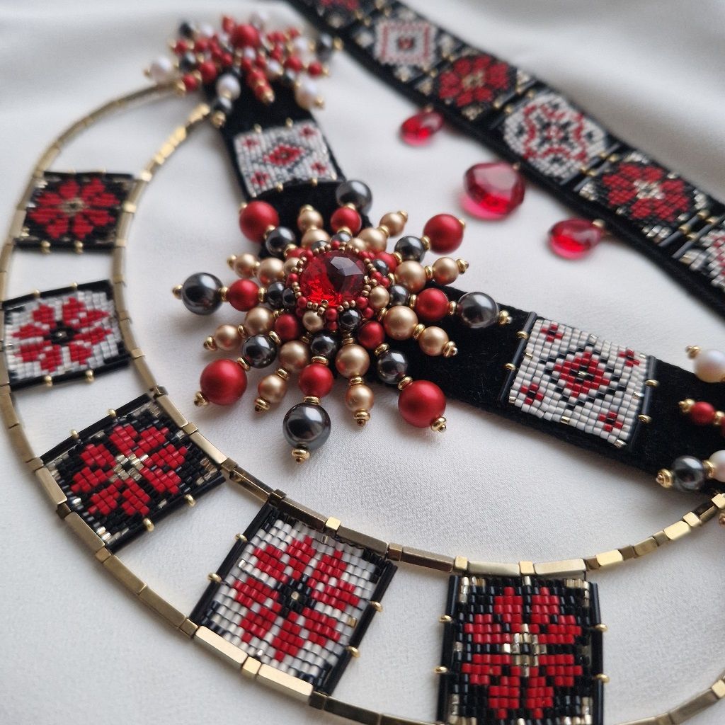 Тема конкурса - дань традициям в современном прочтении. Мне не хотелось сосредотачиваться на каком-то одном этнокультурном стиле. Поэтому я взяла за основу геометрические узоры, которые встречаются во многих культурах славян, и сделала колье, напоминающее по форме ожерелок.
