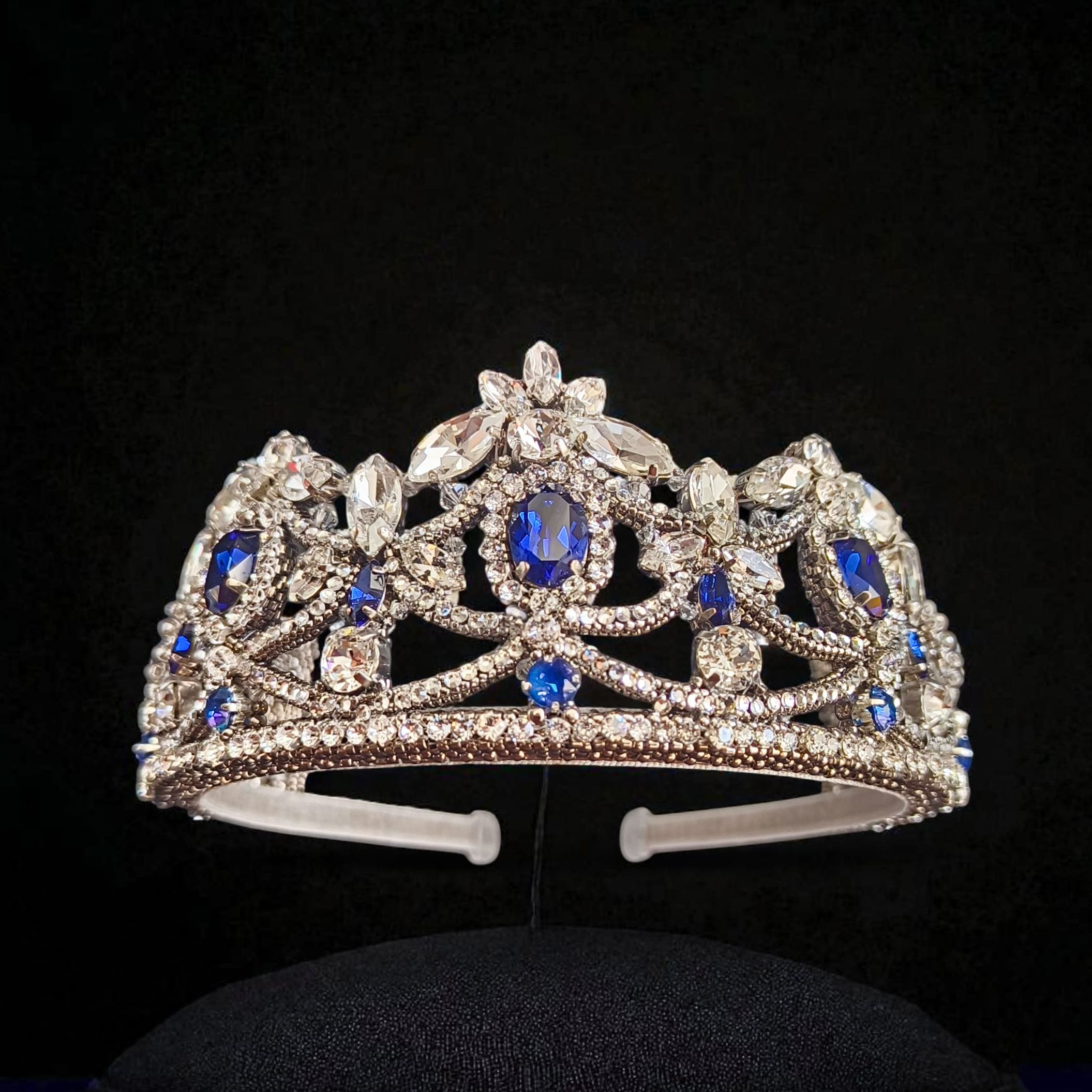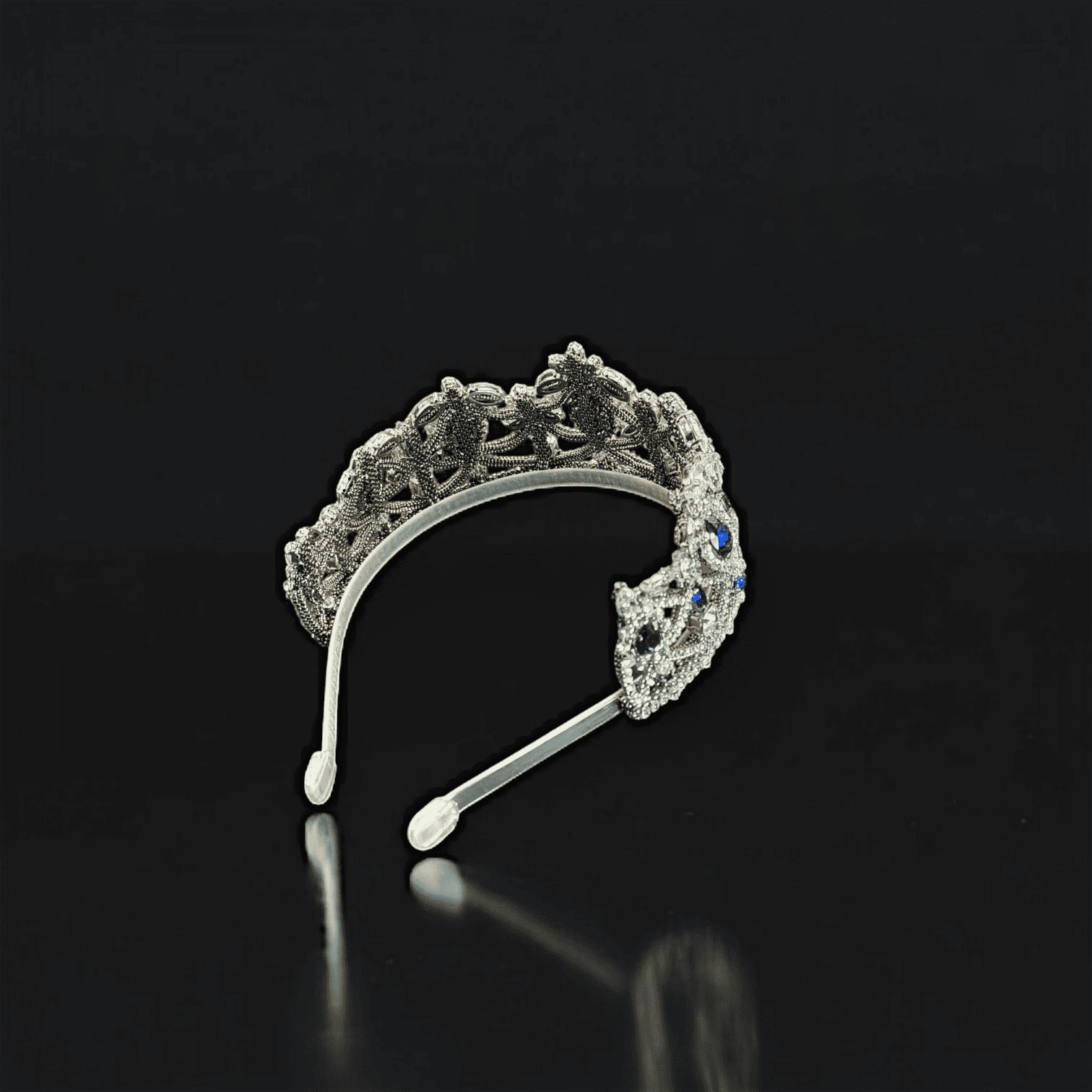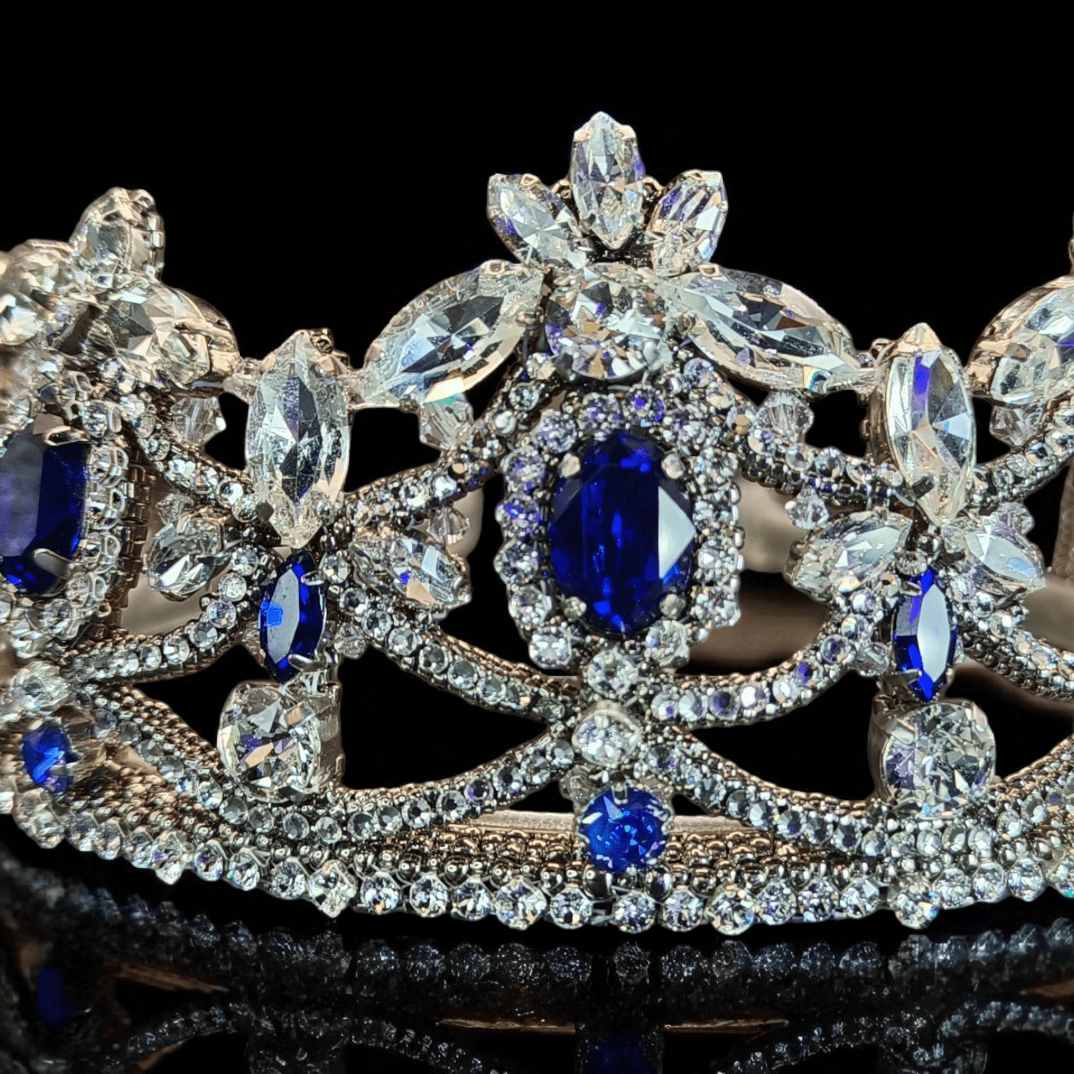Эта утончённая тиара создана для тех, кто ценит аристократическую роскошь и изящество. Глубокие сапфировые оттенки, напоминающие лазурное небо над Веной, сияют в обрамлении кристаллов, словно отражение тысяч огней в залах императорского дворца.
