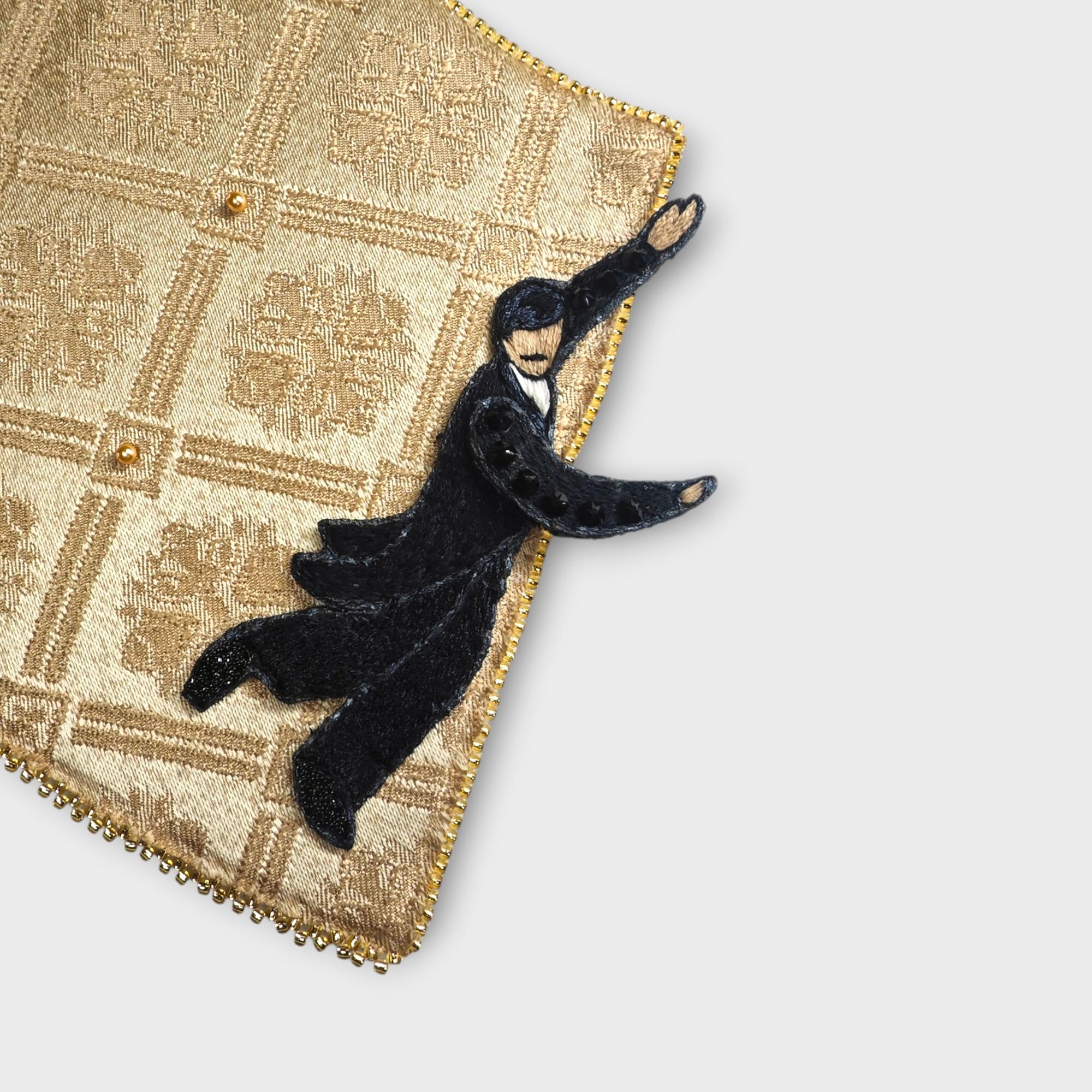 На фоне, напоминающем узор паркета, застыли в изящном движении кавалер и дебютантка. Она парит в его руках, а он бережно ведёт её сквозь время. Паркет под ногами мерцает, словно сохраняя следы всех, кто когда-то танцевал здесь вальс.