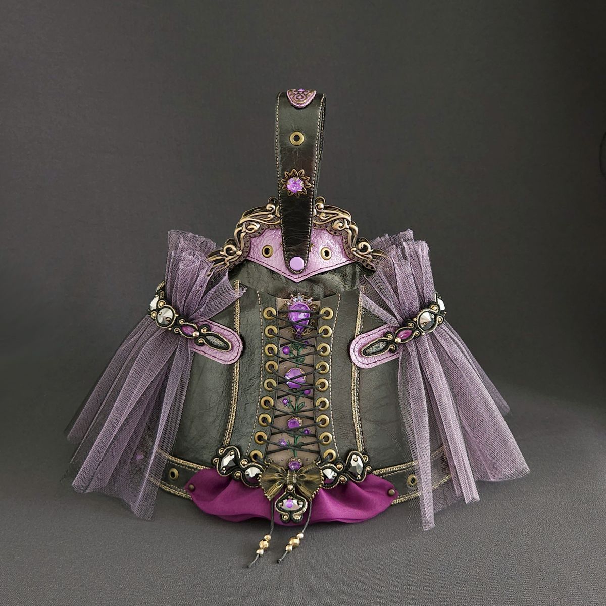 В очертаниях видится силуэт  бального платья  с тугим корсетом. Но сквозь линии шнуровки  на спине можно увидеть яркую и смелую неоновую татуировку вдоль позвоночника.