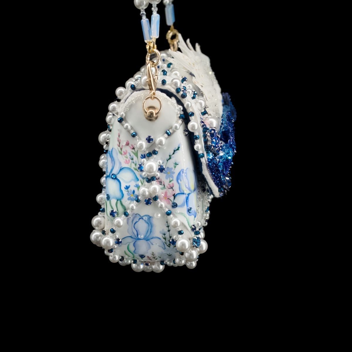 В представленной сумочке этот сюжет обрел свой символичный, счастливый финал, найдя свое отражение в мерцании хрусталя и жемчуга, в бликах расписного «фарфора», как напоминание о хрупкости, казалось бы, незыблемых идеалов и традиций.
