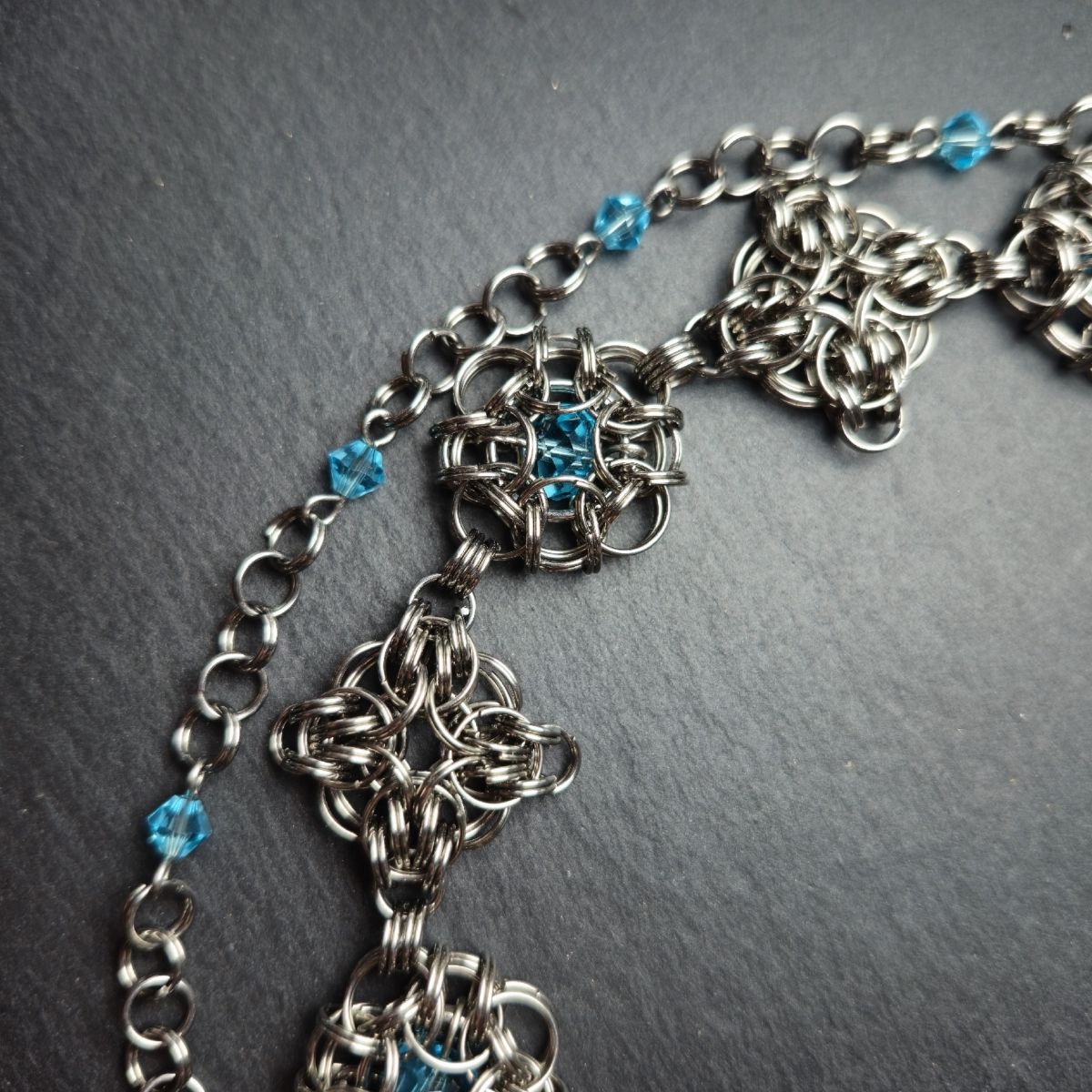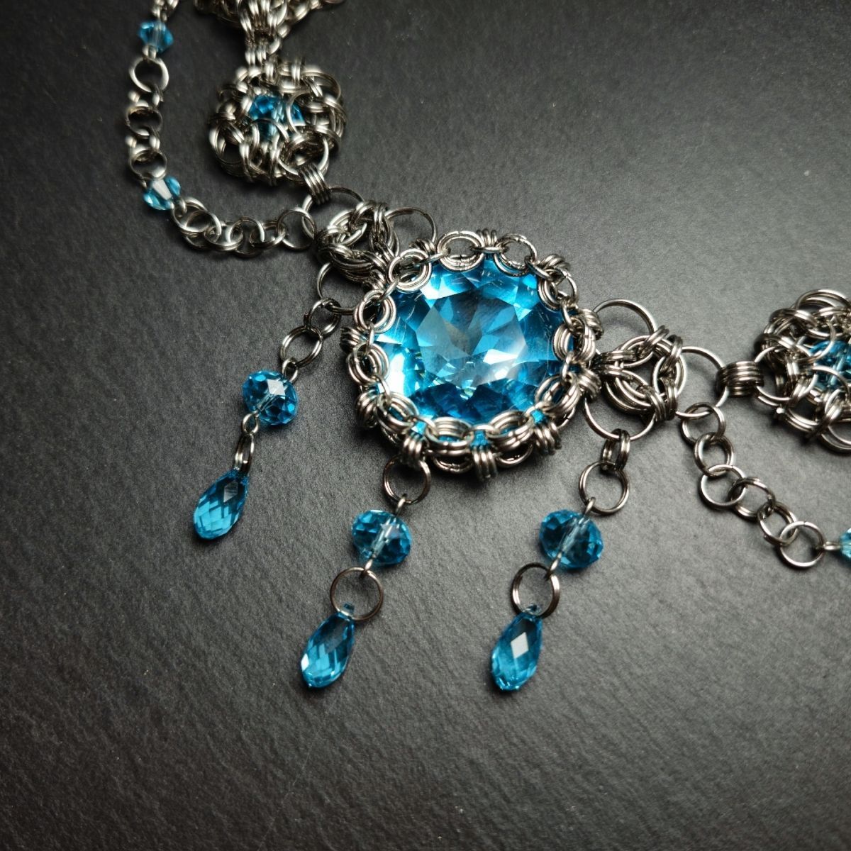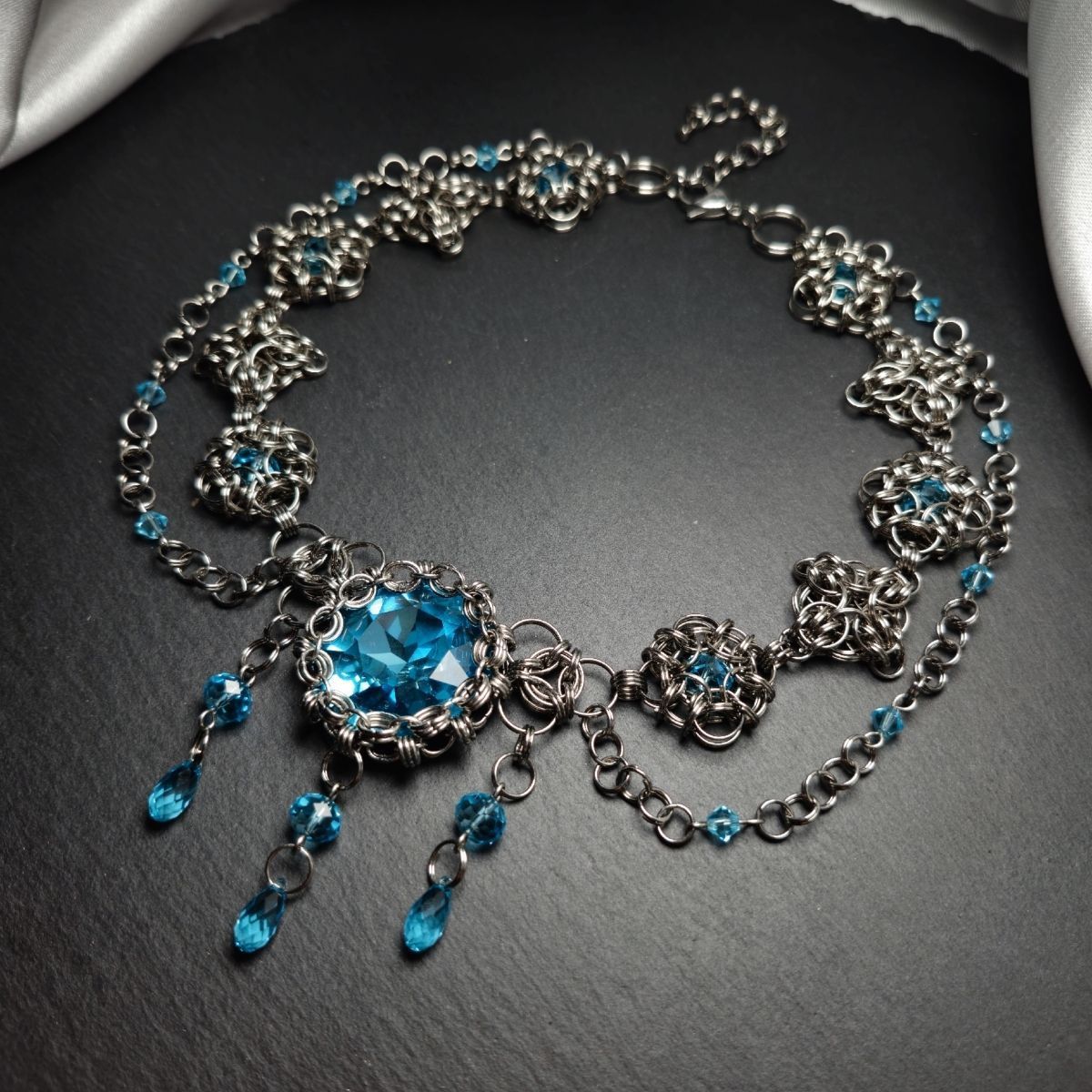 На создание этого кольчужного колье меня вдохновила сказочная повесть «Ундина» немецкого писателя и поэта эпохи романтизма Фуке Де Ла Мотт Фридриха. Книга была опубликована за четыре года до присоединения Австрии к Германскому союзу и стала очень популярной среди австрийцев.