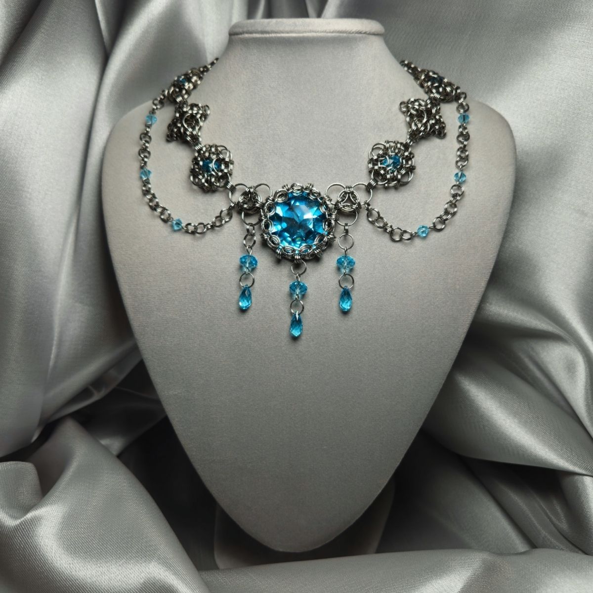 В моём колье большое количество кристаллов Сваровски такого же голубого цвета, как глаза Ундины. Они олицетворяют родную стихию девы и её слезы от разбитого сердца. Сталь в украшении передаёт смелый, стойкий характер и внутреннюю силу героини, которая позволила ей не только простить мужа, но и убить его, даруя освобождение.