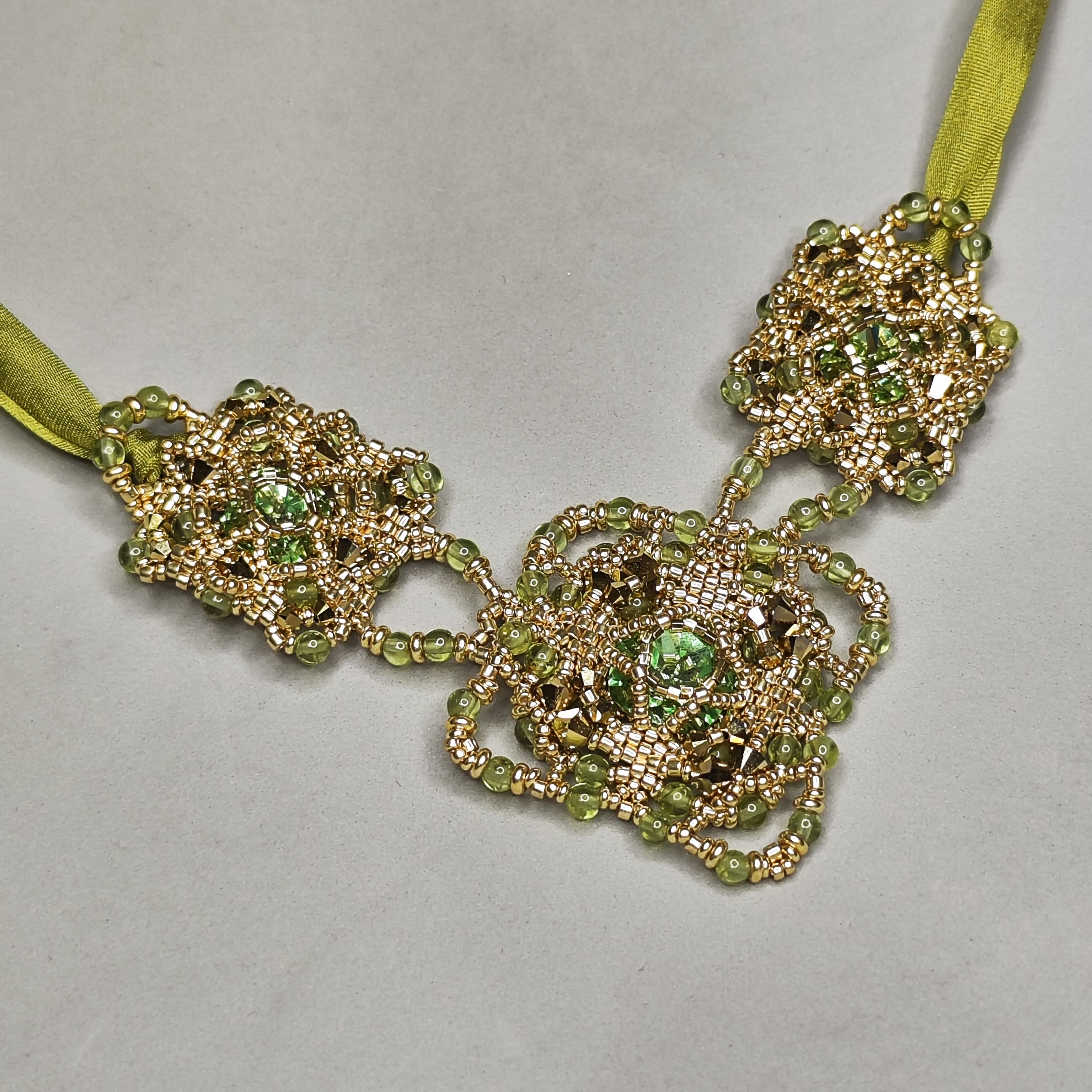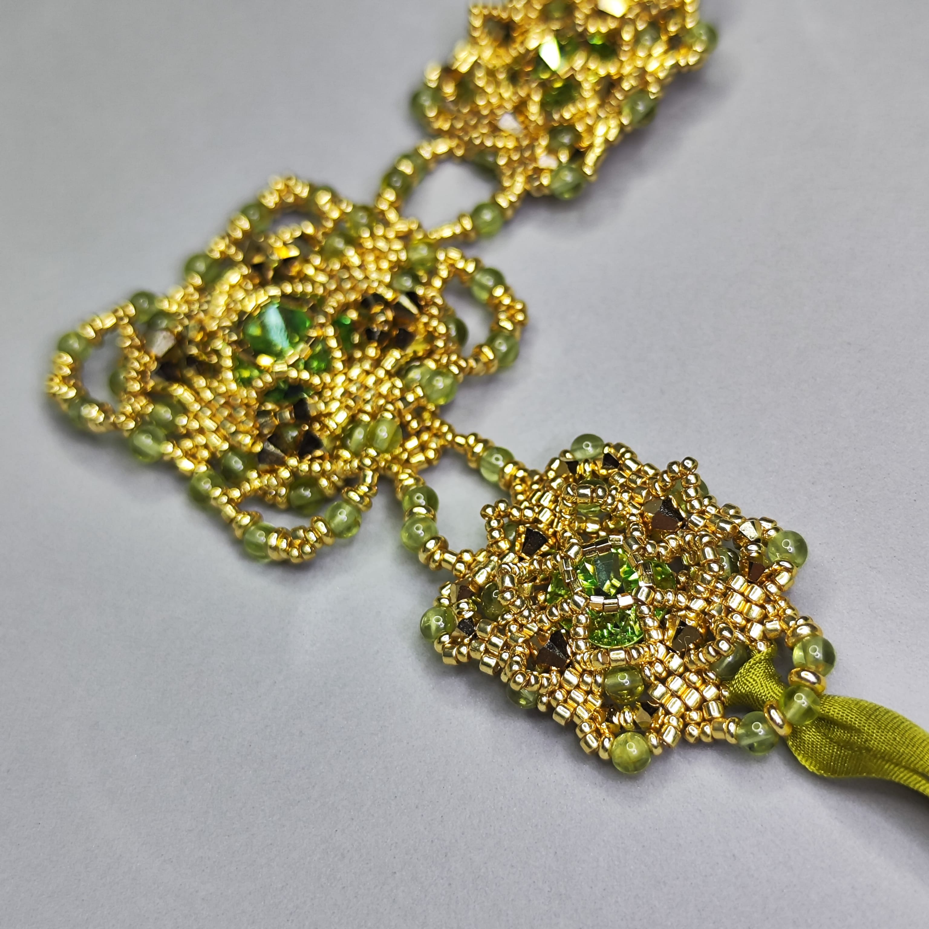 Не можешь идти к мечте - лежи в направлении мечты. Так ведь говорят? Но иногда стоит сделать три шага вбок и обернуться назад - взглянуть в отражение себя. Три зелёных кристалла "красивое, очень хочу и потом сделаю что-то" оказались рядом с золотом и вдруг сложились в идеальное маленькое колье - цвета моего выпускного платья. Вот бы тогда n-цать лет назад - и танцевать, в зелено-золотом, в дебютный вечер...