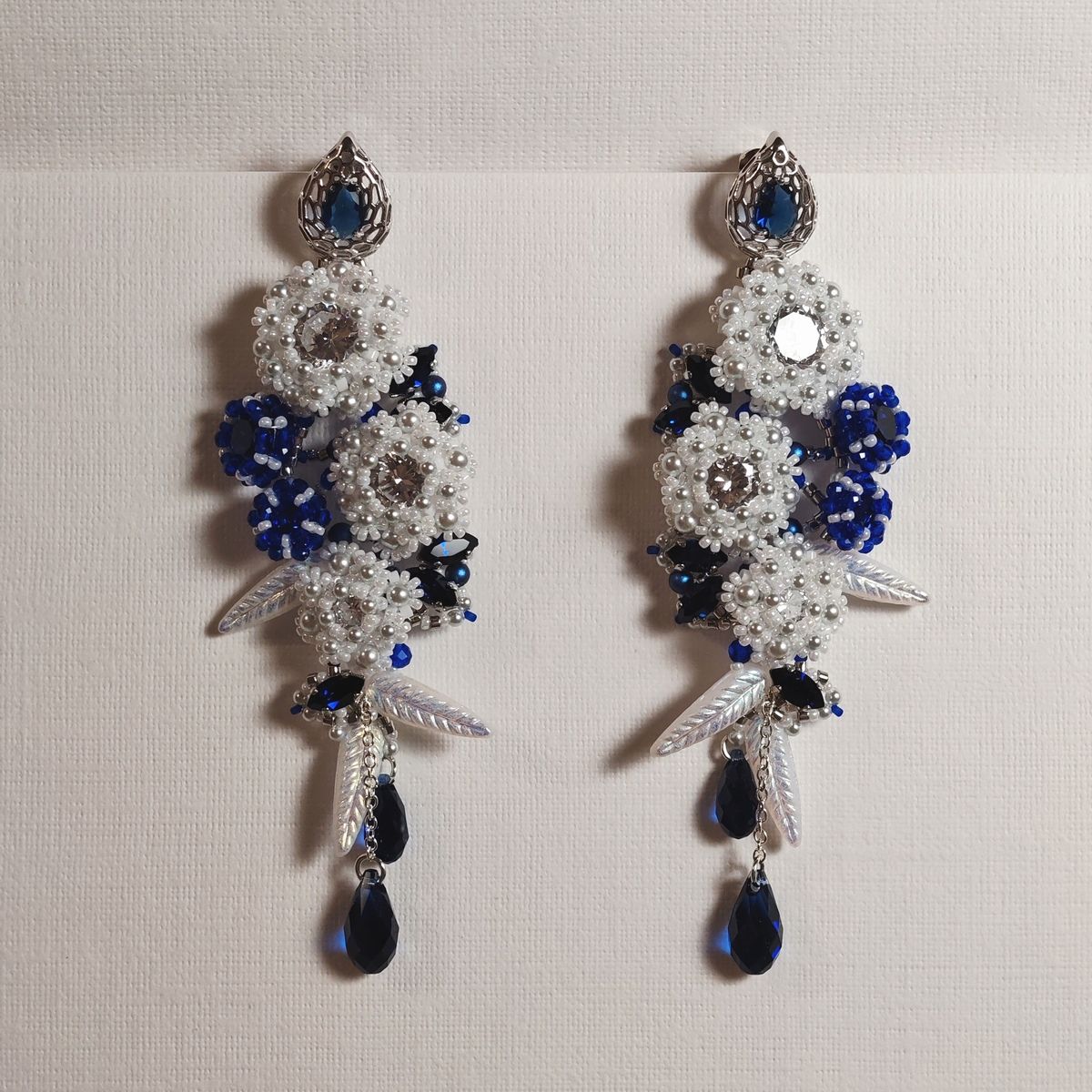 Их окружают стеклянные листья. А вниз, подобно нотным станам, струятся нити с тёмно-синими подвесками-каплями. Это не капли воды, а капли самой ночи, тяжёлые, насыщенные тайной бездонного небесного океана. С каждым шагом они мерно колышутся, словно тихая мелодия, обращённая к сердцу.