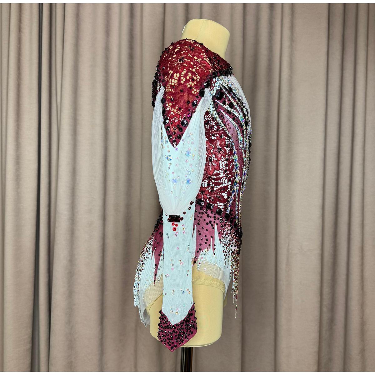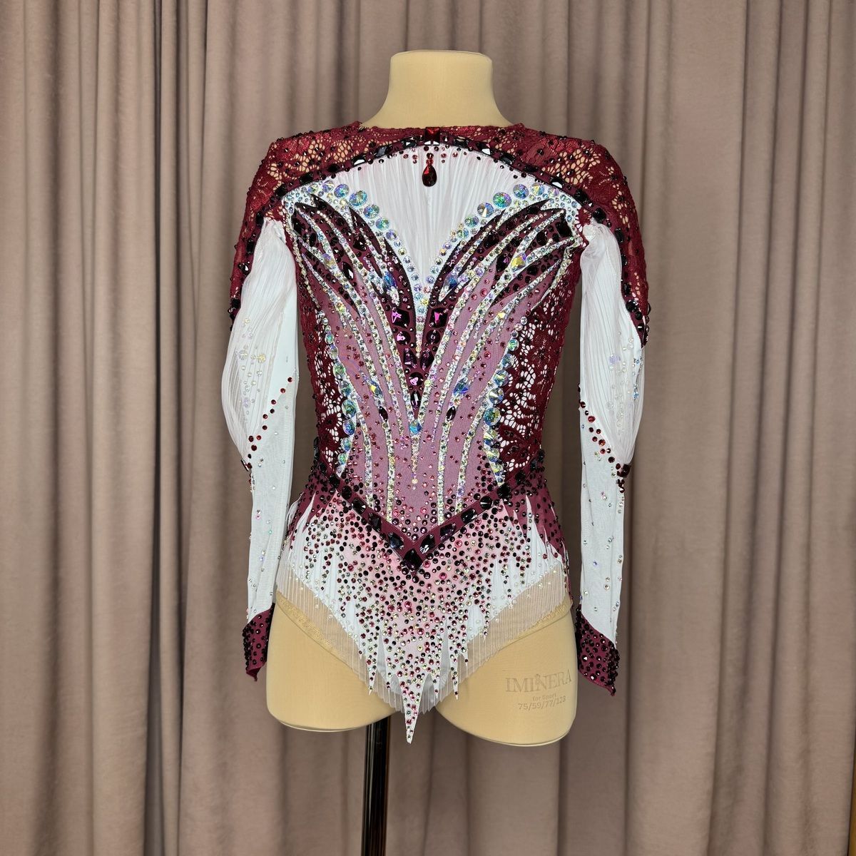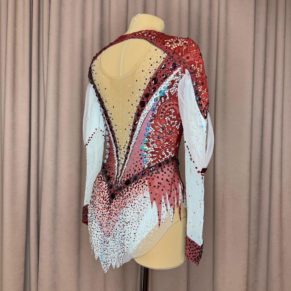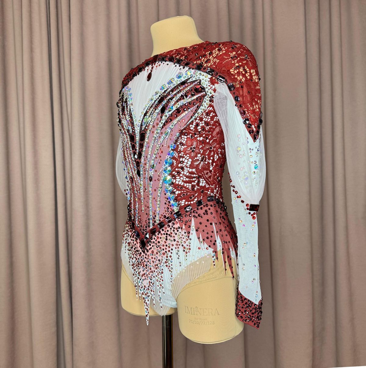 Материалы: Костюм выполнен из бифлекса, эластичной сетки и кружева,струящегося плессированного материала. Все эти ткани обеспечивают свободу движений и подчеркивает грацию гимнастки. На поверхности ткани использованы блестящие стразы, которые добавляют эффект сияния и делают костюм более нарядным.
